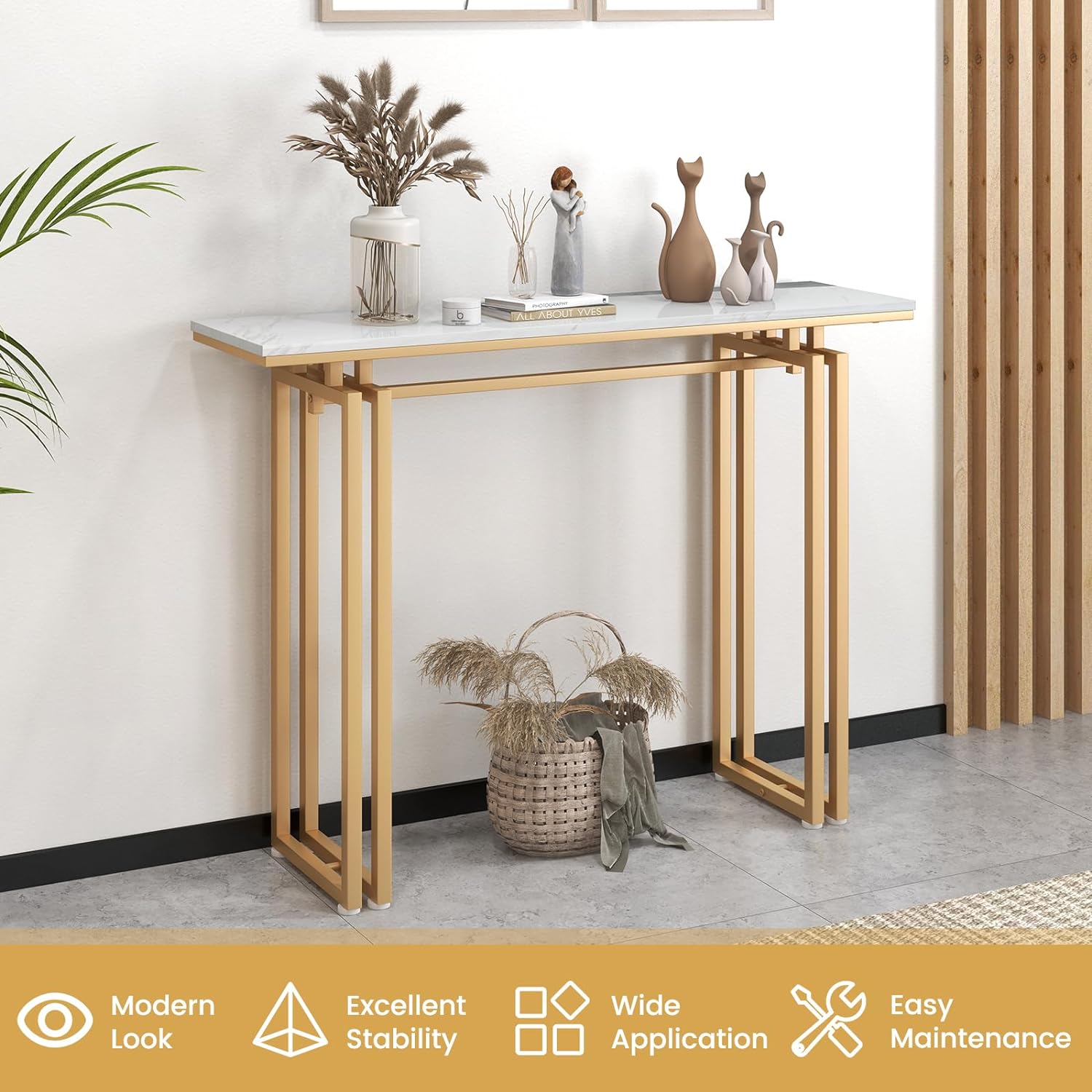 110cm Console Table, Faux Marble Sofa Table w/Sturdy Metal Legs, Adjustable Feet, Modern Entryway Table, Perfect for Foyer, Living Room, Hallway (Gold)