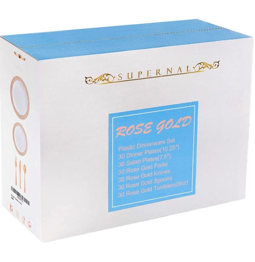 - Value Pack:Ā The gold plastic tableware set include 30 dinner plates, 30 salad plates, 30 gold forks, 30 gold knives, 30 gold spoons, 30 gold tumbers which are put in gift box. If you can't use them all in one time, pls put them back to the box which will keep clean.