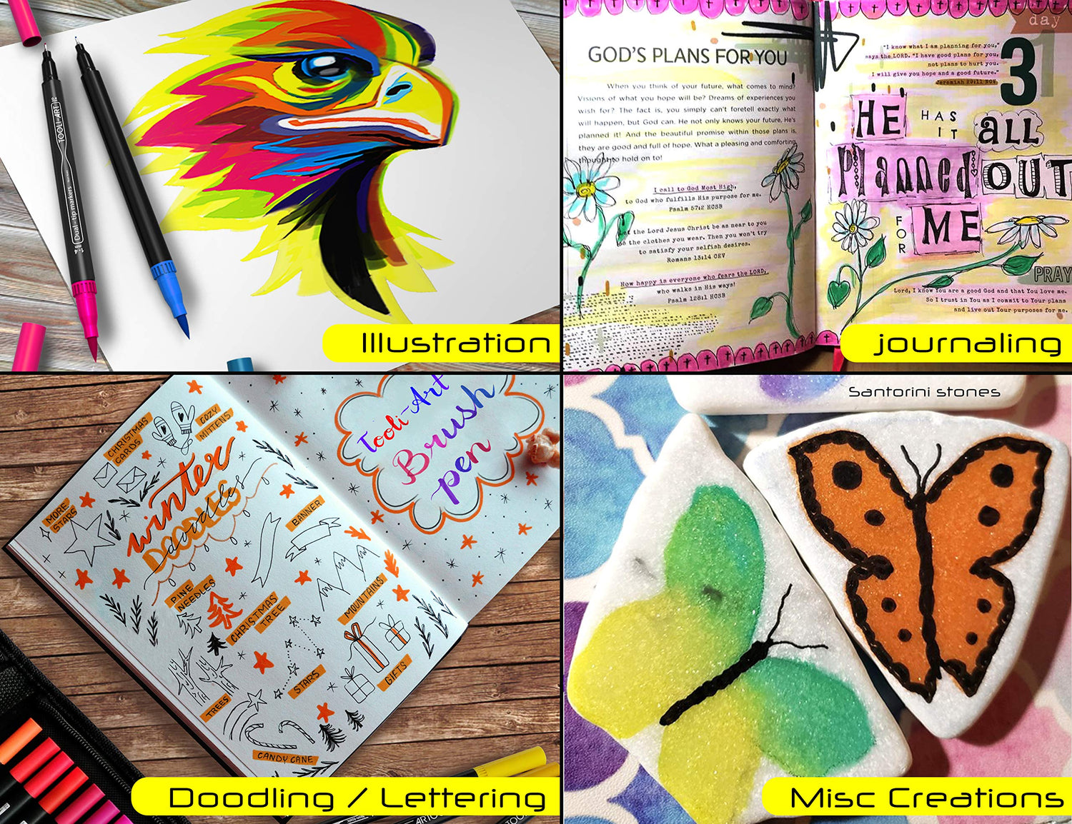 - VERSATILE DUAL TIPS - Don't limit yourself to single sided markers. The 1-4mm flexible brush tip makes elegant and fluid thick to thin strokes like the pros. Easily block in larger areas. Ideal for illustrations, shading, colouring, or highlighting, scrapbooking. The 0.4mm fineliner tip will give you precise control when drawing, detailing, outlining, doodling, journaling, or taking notes.