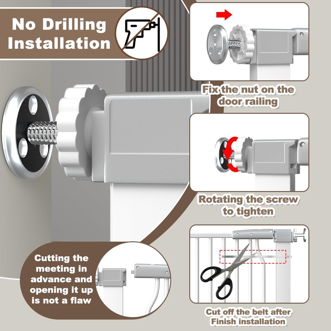 - Easy installation: Installing our extra tall baby gate is effortless.It comes with 4 adjustable pressure bolts for a quick 5-minute installation, no tools or drilling are required, and our tall dog gate won't damage your house walls.There are also several expansion accessories for you to choose the appropriate width. Please measure your openings before purchase this wide baby gate