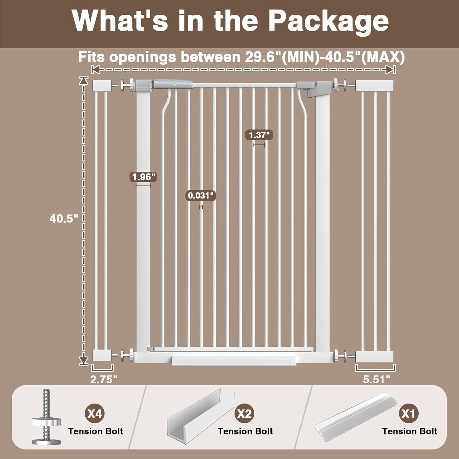 41" Extra Tall Baby Gate for Doorways and Stairs No Drill, Adjustable 29.9-40.9'' Auto Close Dog Gate Indoor, Pressure Mounted Walk Through Swing Wide Pet Gate, Tall Cat Gate with Expansion Kit, White