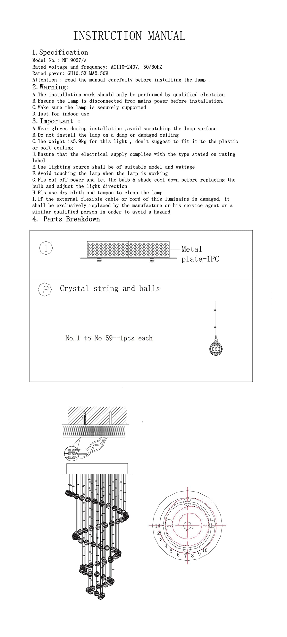- Bulb Type and Size: 5 x GU10 bulbs, Max 50W ( bulb Not include). Voltage: 220V~240V. Size: Diameter 40cm(16 inch) Height 80cm(31 inch). Compatible with many kind bulbs: Dimmable Bulbs, Energy saving bulbs, Led Buldb,Halogen Bulbs etc.Fully dimmable when used with dimmable bulbs and a compatible dimmer switch (not included).
