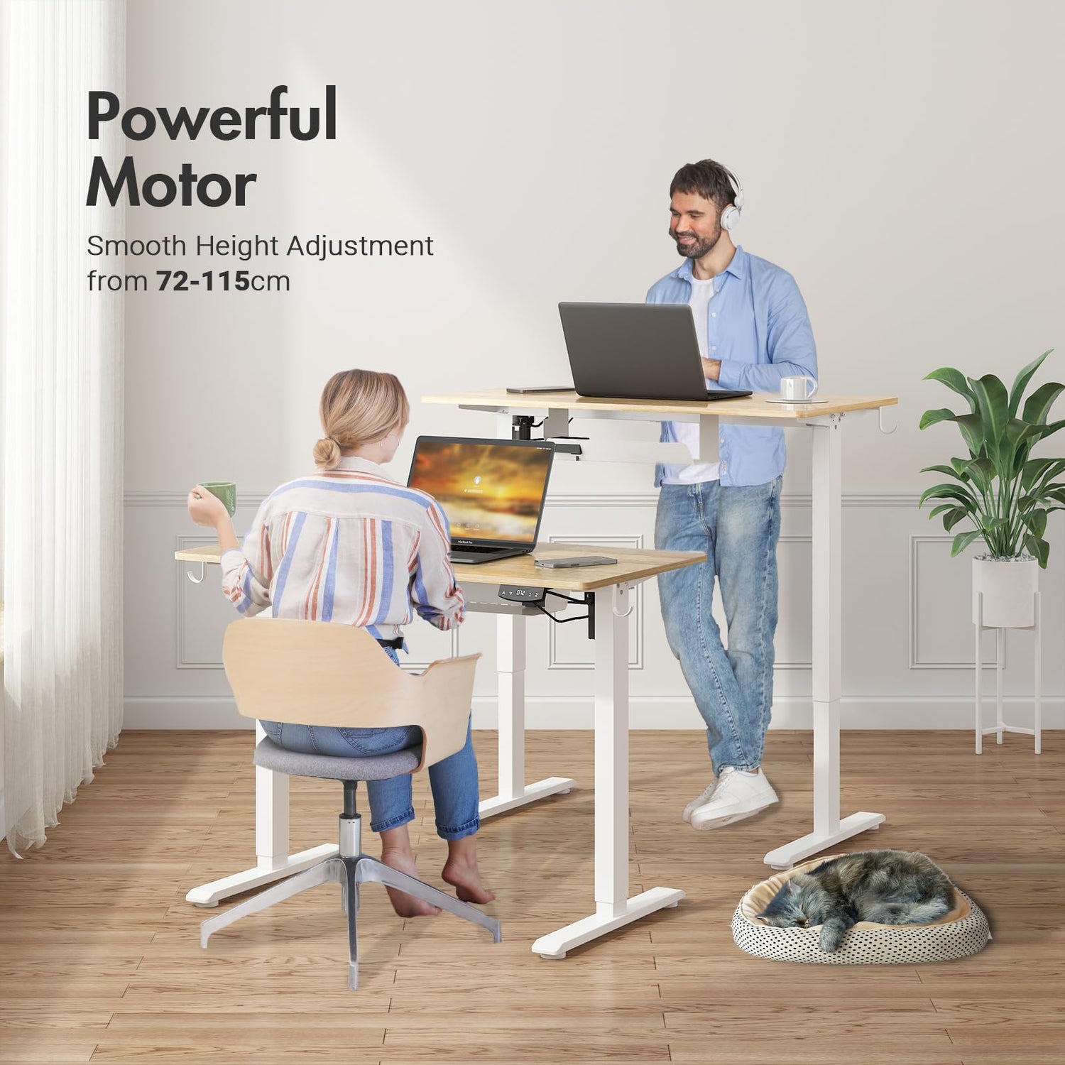 Electric Standing Desk, Height Adjustable Ergonomic Sit Stand Desks with Hanging Hooks and Cable Management, 100 x 55 cm Whole Piece Desktop, for Small Space, White Frame+Oak Desktop