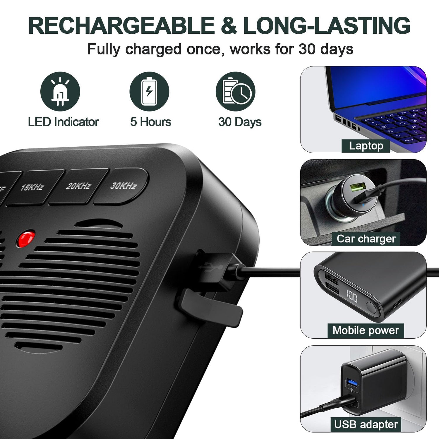 - Rechargeable and Easy to use: This dog barking silencer is designed for convenience and versatility; it can be effortlessly hung on a tree, garden fence, table, or even a dog house; this device is equipped with a robust 1500mAh rechargeable battery that offers up to 30 days of use after just 5 hours of charging; simple to operate and effective, itās an ideal solution for managing your own or your neighborās barking dog; please ensure the device is fully charged before initial use