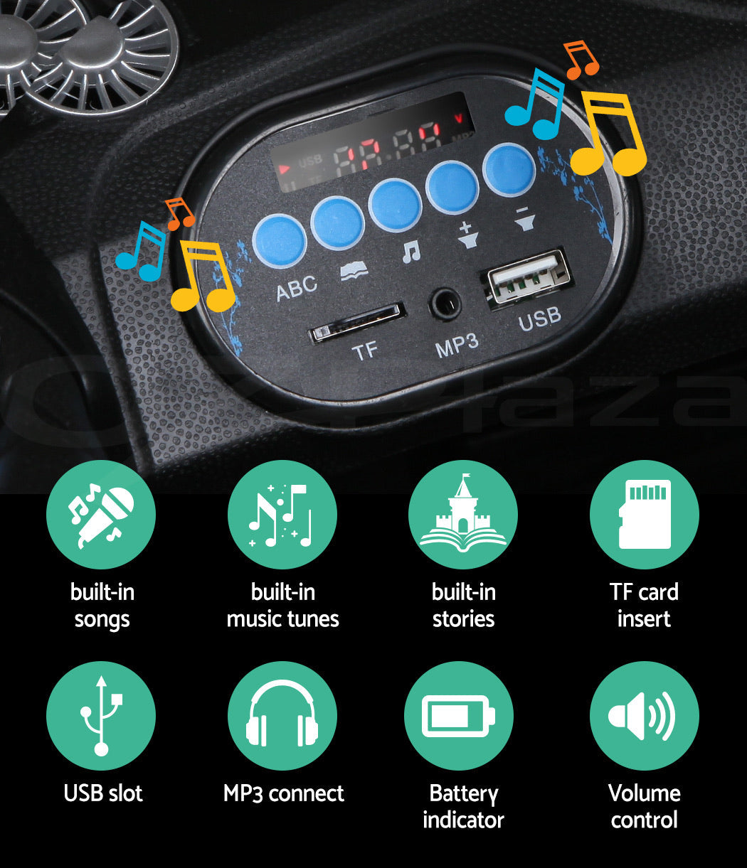 Outside, the Roadster Ride On Car is a work of automobile art. The midnight black svelte silhouette is absolutely gorgeous with its brilliant lacquer finish. Open the lockable doors and the commanding array of controls await your child’s expert handling. MP3 connectivity gives more music options in addition to the built-in tunes while the wide sports seat with safety belt ensures your kid is well-strapped for an exhilarating ride.