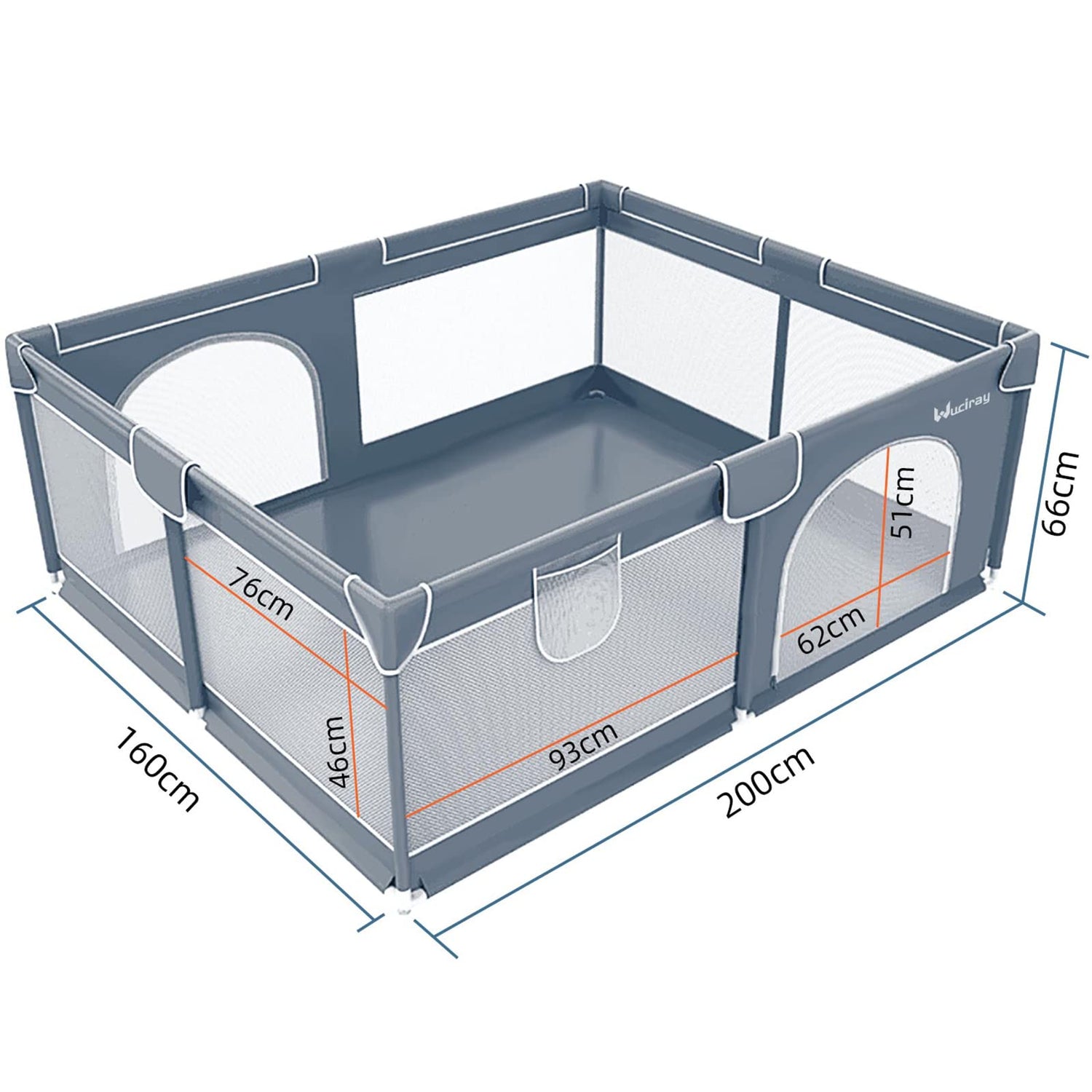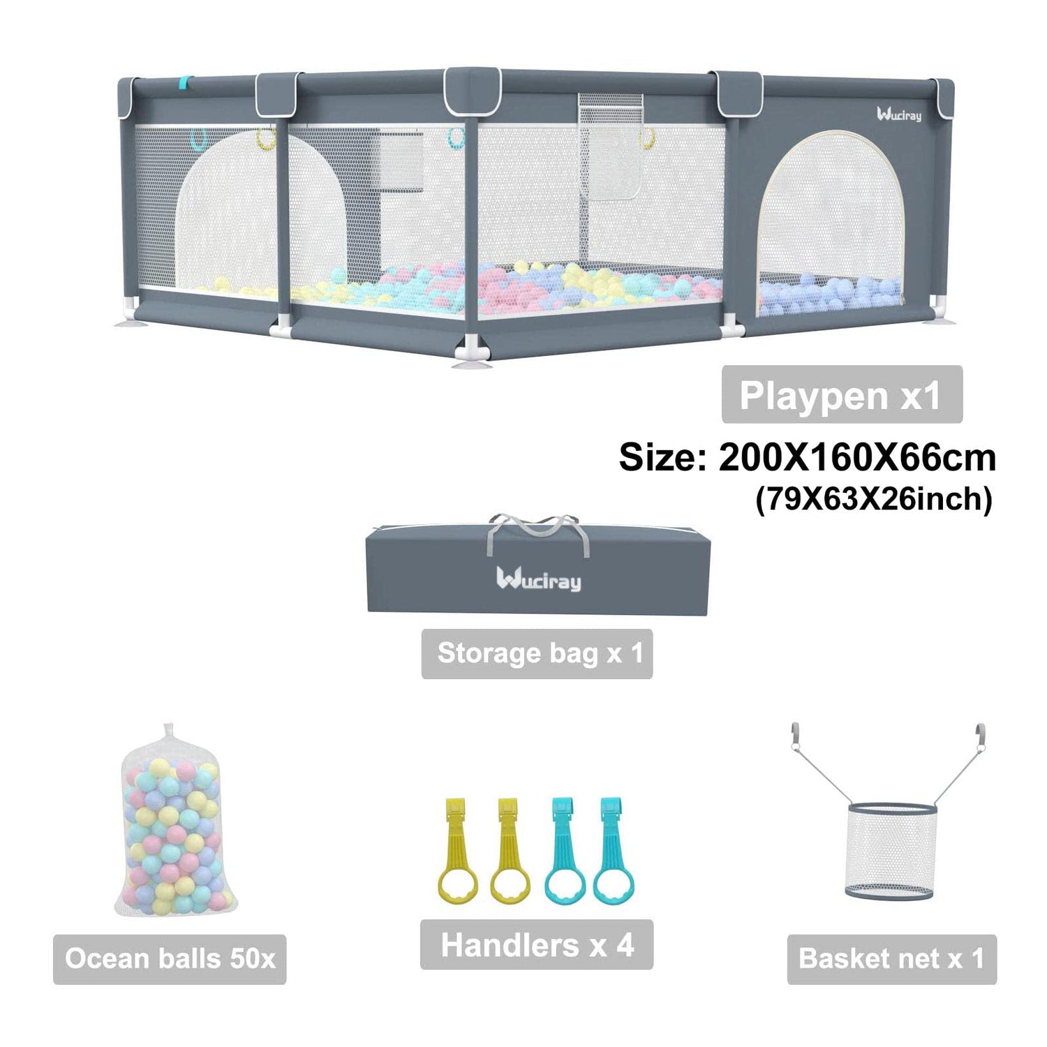 - 200cm Extra Large Baby Playpen: This baby playpen is equipped with 200*160*66cm large play space, which is long enough for the baby to stand and walk. The playard contains 50x ocean balls,4x handlers, and 1x storage bag.