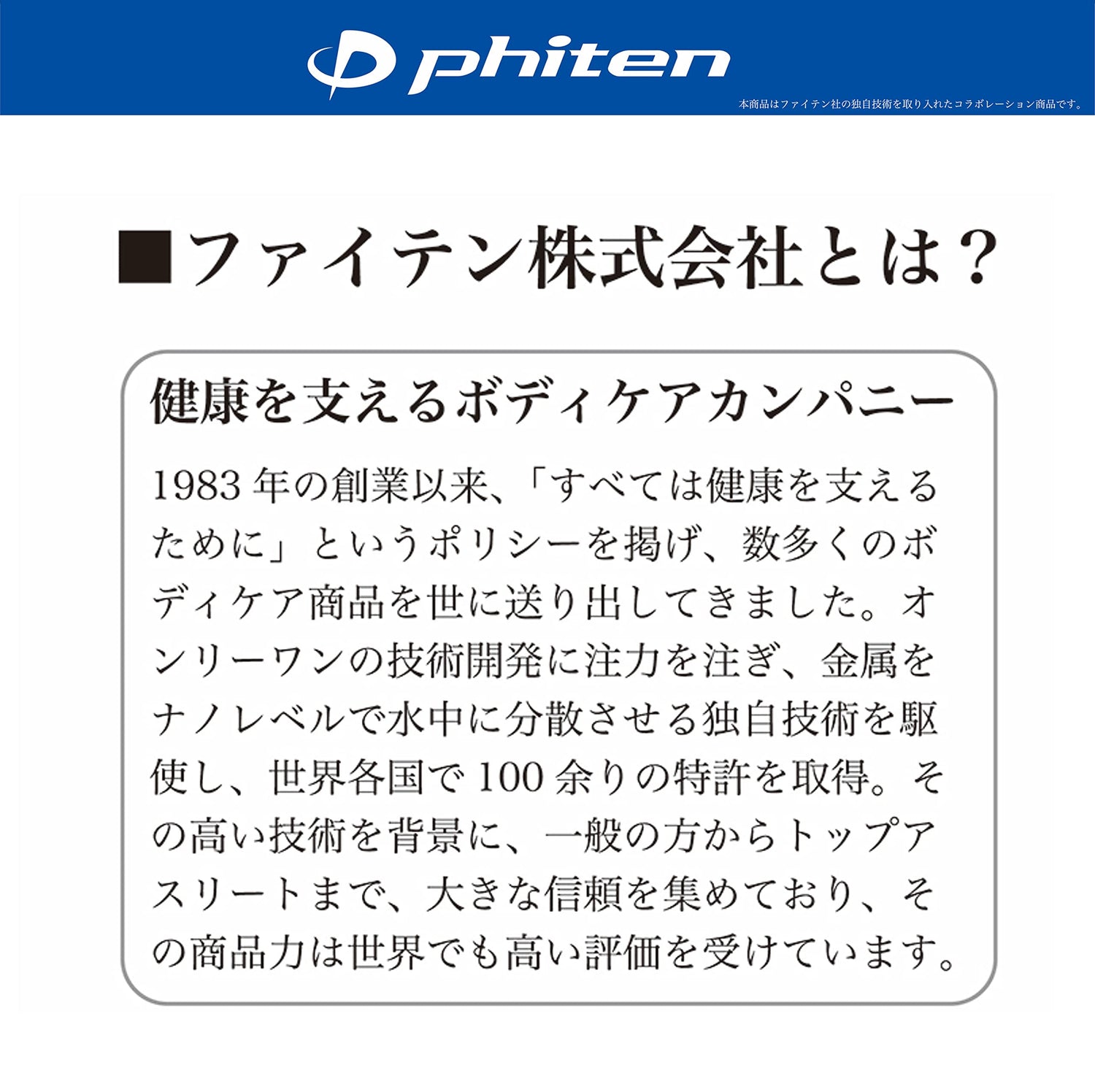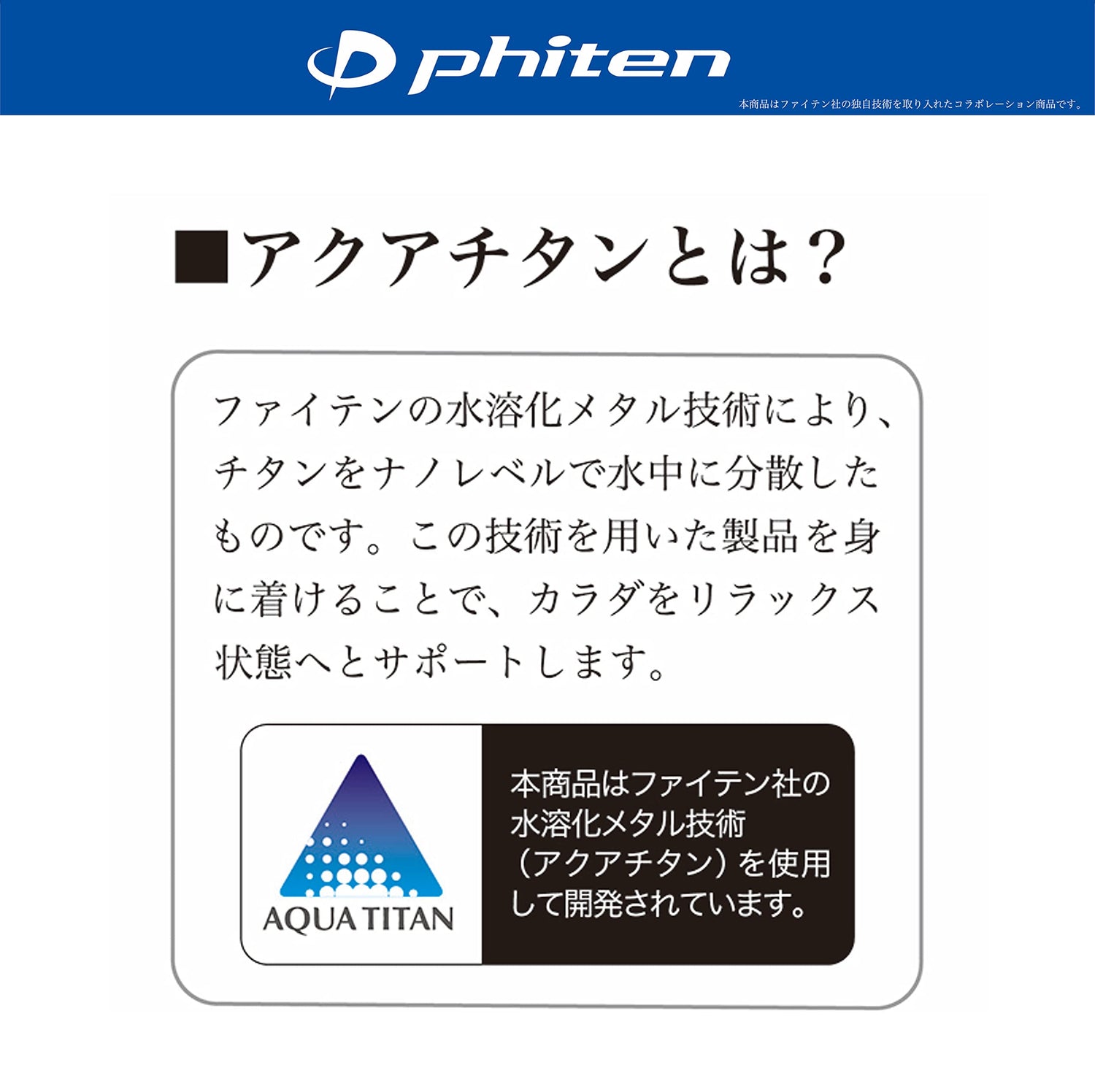 - This product is developed using Phiten's water-soluble metal technology (aqua titanium)