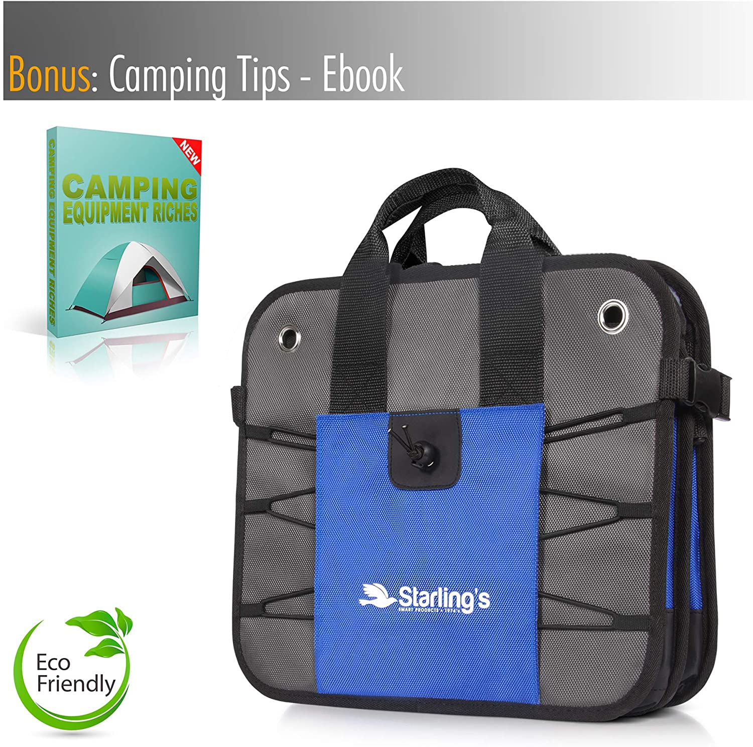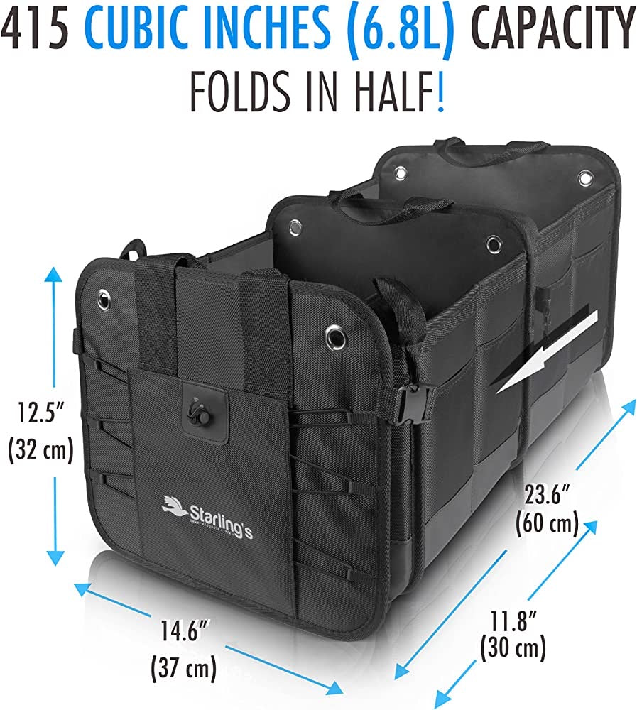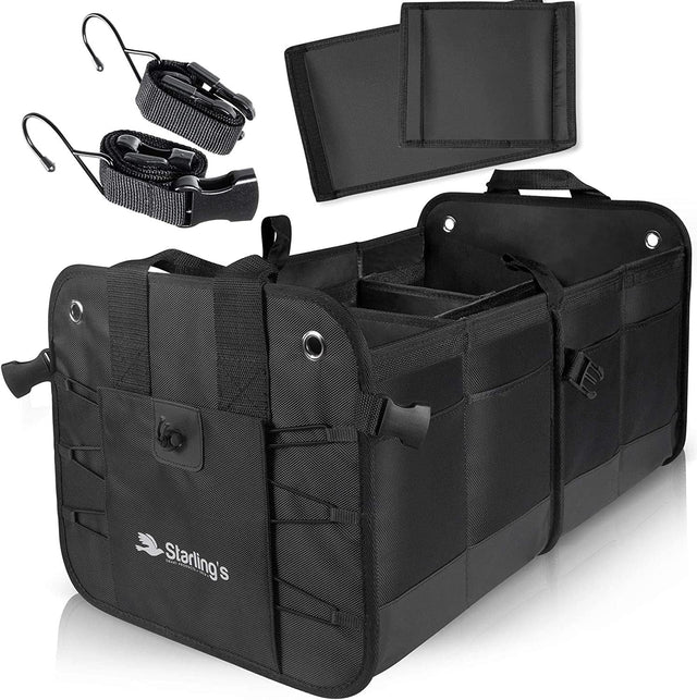 - SIMPLY THE BEST & PERFECT SOLUTION to clutter and mess in your trunk rear or backseat, home, or garage! The Starling's Eco-Friendly Cargo Storage Container expands up to 2 Feet Long with plenty of compartments to put your Car tools and Equipment, groceries, grocery bag, emergency tools, cleaning supplies, household belongings, etc. Cargo organizer tote, in car storage, truck bed storage. Best for SUV, Truck, Auto, Jeep and practically any Vehicle.