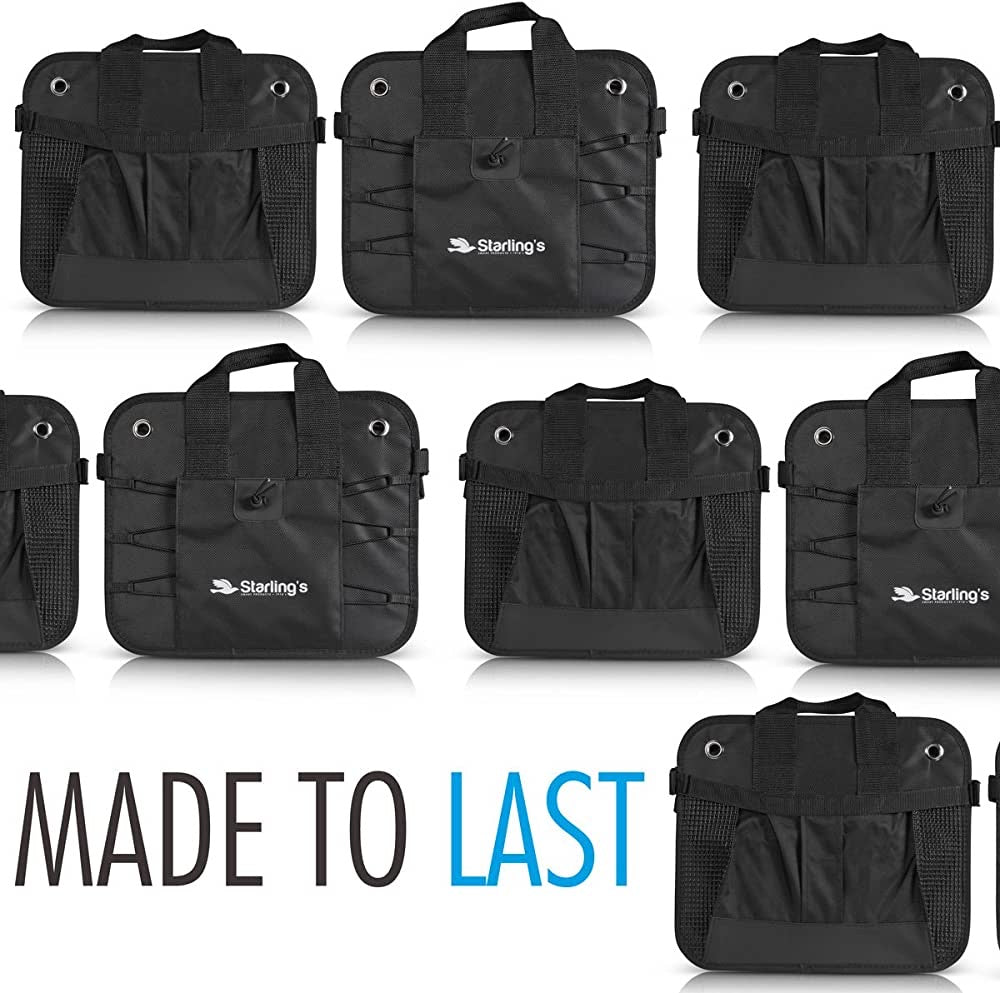 - DURABLE & STRONG CONSTRUCTION ā CUSTOMIZABLE CARGO COMPARTMENTS - Starling's car organizer Made of Strong Durable 1680D Oxford Polyester with extra stitching and a solid 3-layer waterproof bottom board, this trunk carrier will last a long time with repeated use. Its dividers have Super Strong Polyester - covered cardboard sections that will not bend or collapse easily due to added weight. With its Innovative Design, the organizer stays firm and sturdy also without any cargo in it.