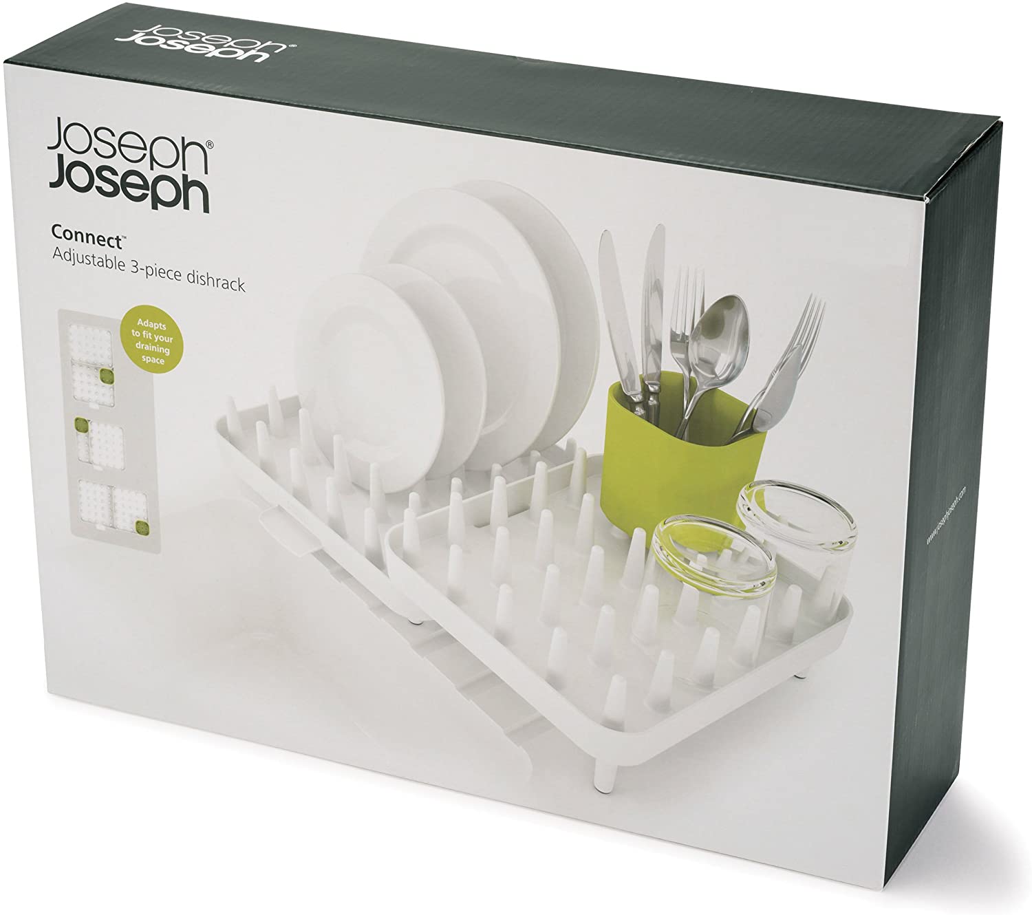 Adjustable 3-piece dish rack Made up of three movable components, this highly adaptable drainer can be placed in a number of different ways to make the most of the sink space you have. With widely-spaced spikes that allow for all types of washed items to be dried and an integrated spout that drains excess water, it’s perfect for washing up after single or even family-sized meals. The cutlery holder can be placed anywhere on the rack for maximum convenience, and the non-slip rubber feet will ensure that no matter how you set Connect™ up, it will stay in place.
