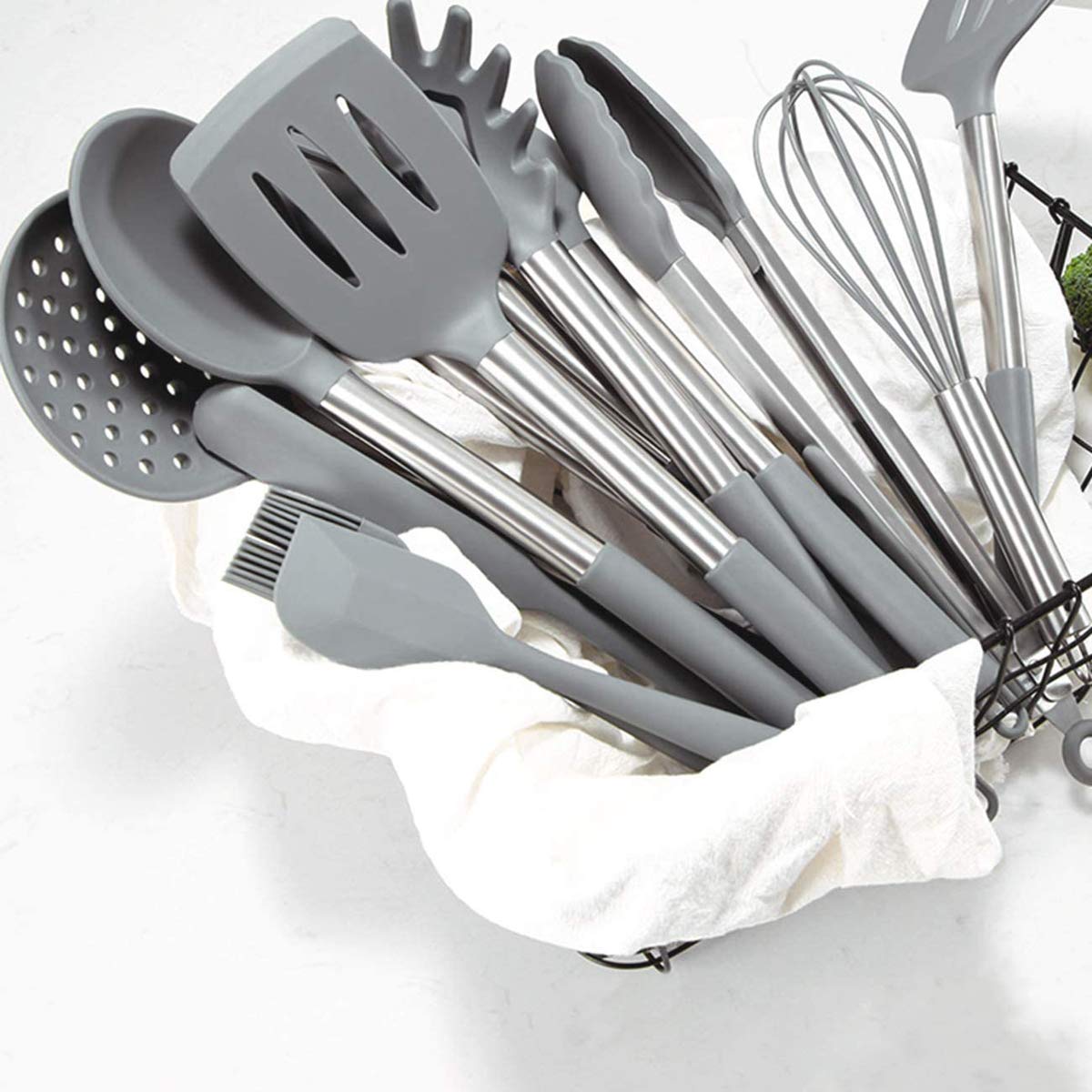 Cooking Utensil Set, 25pcs Non-Stick Heat Resistant Silicone Kitchen Utensils Spatula Set with Holder, Stainless Steel Handle (Gray)