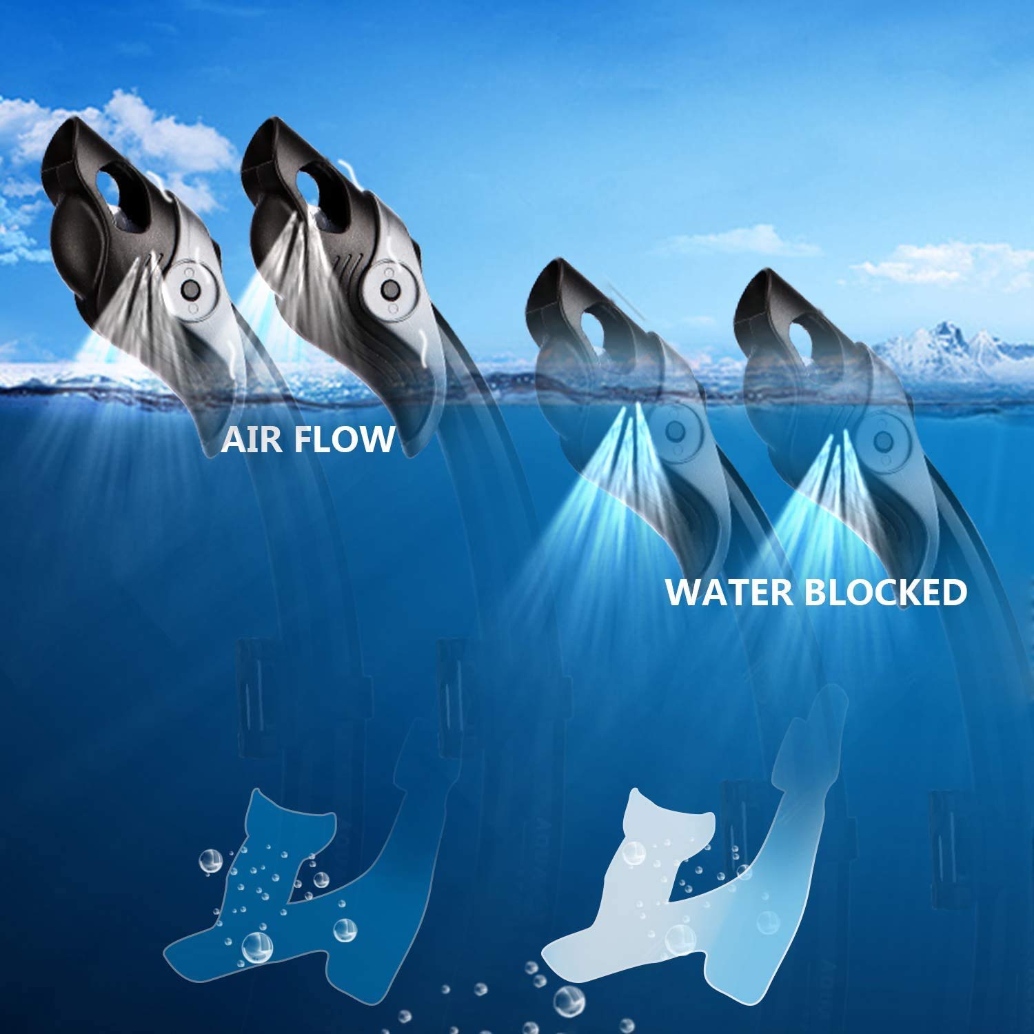 • Our dry snorkel uses system at the opening of the dry snorkel to keep water out. This system closes the opening at the top of the snorkel while submerged under the water and reopens when the snorkel reaches the surface. Even waves crash overhead, the splash-guard will prevent water from coming into the snorkel. Unlike the float ball valve which gets lodged easily by small sands or kinds of stuff, our new design valve won't be stuck, which give you comfortably breath.