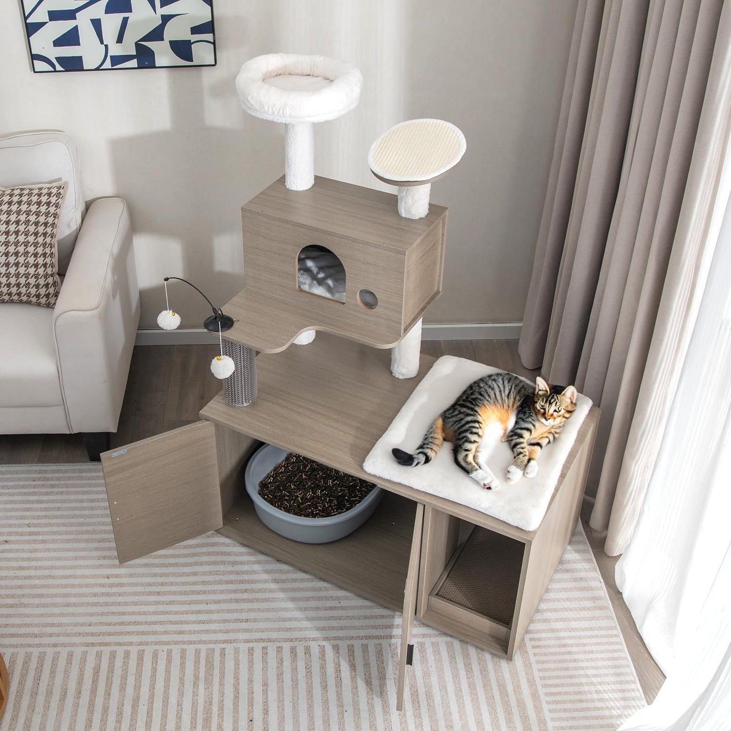 2 in 1 Cat Tree with Litter Box Enclosure, Modern Cat Tower with Cat Condo, Top Perch, Scratching Board, Multiple Platforms, Dangling Balls, Cat Litter Box Furniture for Indoor Cars