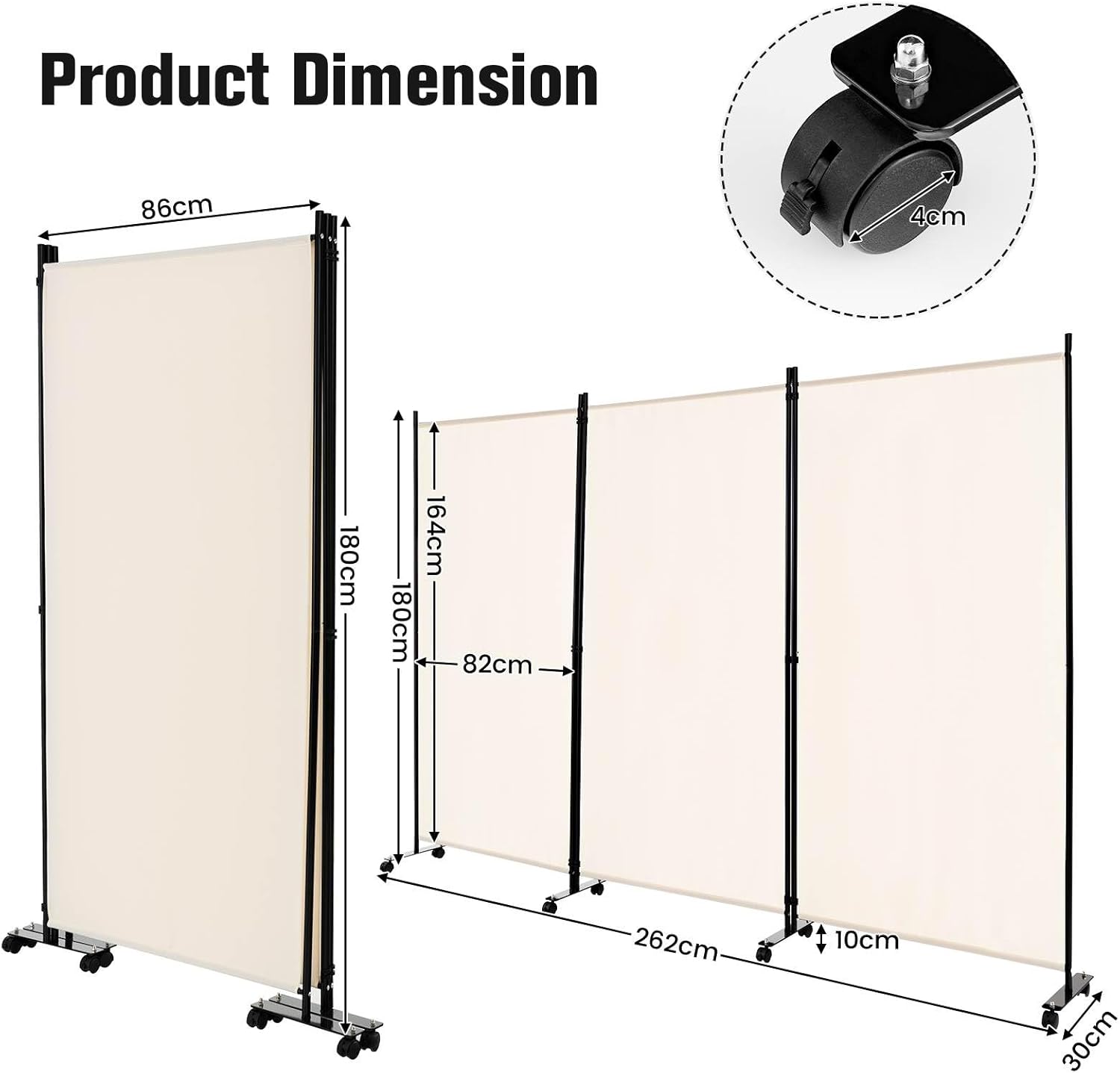 3 Panels Folding Privacy Screen, 180cm Tall Room Divider with Metal Frame & Wear-Resistant Fabric, Freestanding Partition Wall Divider with Rolling Wheels for Home, Office, Hospital