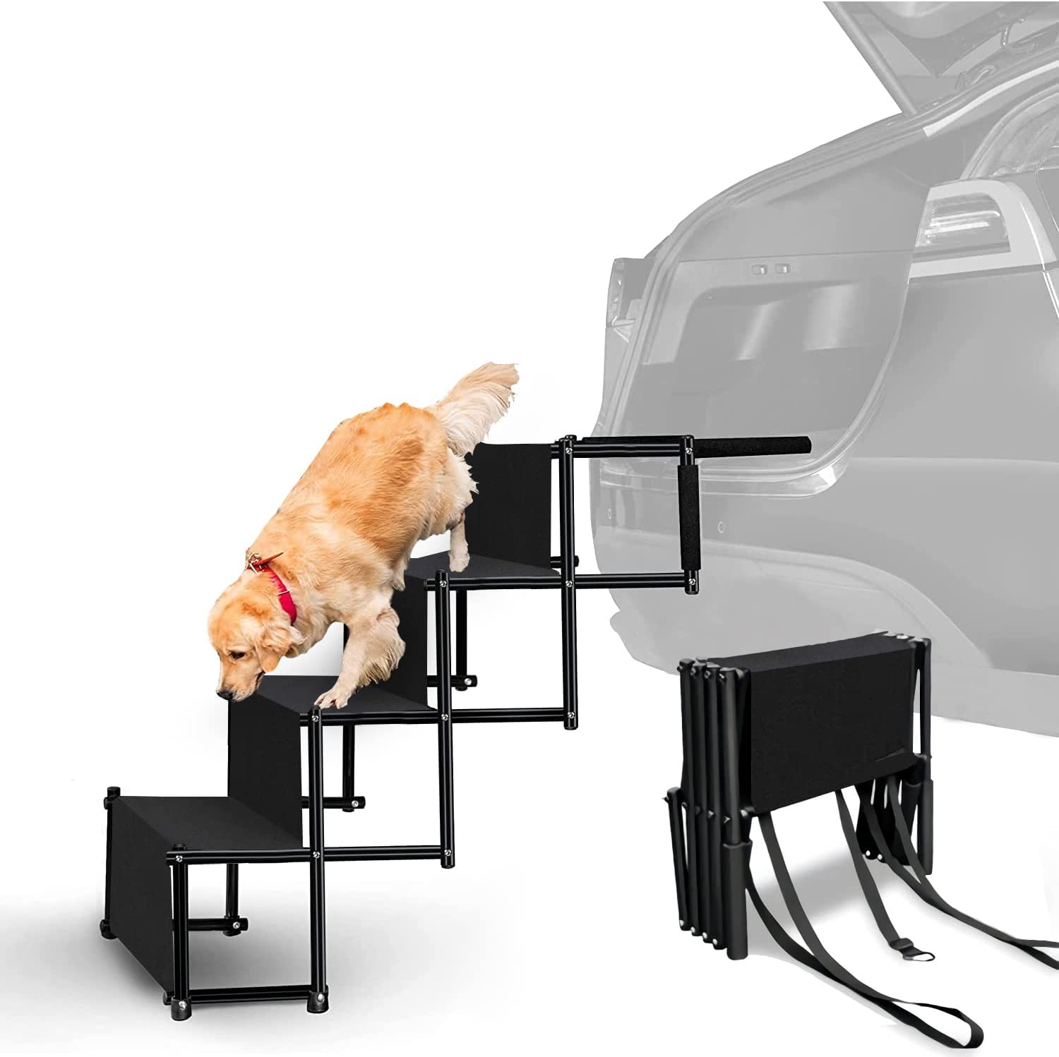 - Save space: The large dog car ramp can be opened and closed like an accordion, dog ramps for large dogs reduce your dog's muscle and joint strain caused by jumping. Our puppy ladder folding only, there is no tool required to install it, and these dog steps can be folded down for easy storage.