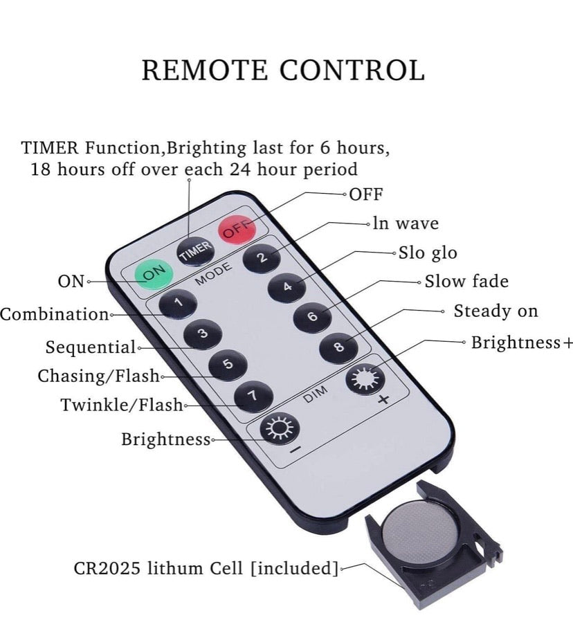 - 8 Modes settings with Remote Control: 13-key buttons:①TIME Mode (6 hours on and 18 hours off automatically cycle);②8 Modes: combination, in waves, sequential, slogs, chasing/flash, slow fade, twinkle/flash, and steady on;③Press DIM- or press DIM+ of remote control to adjust the brightness of the lights; ④on and off.