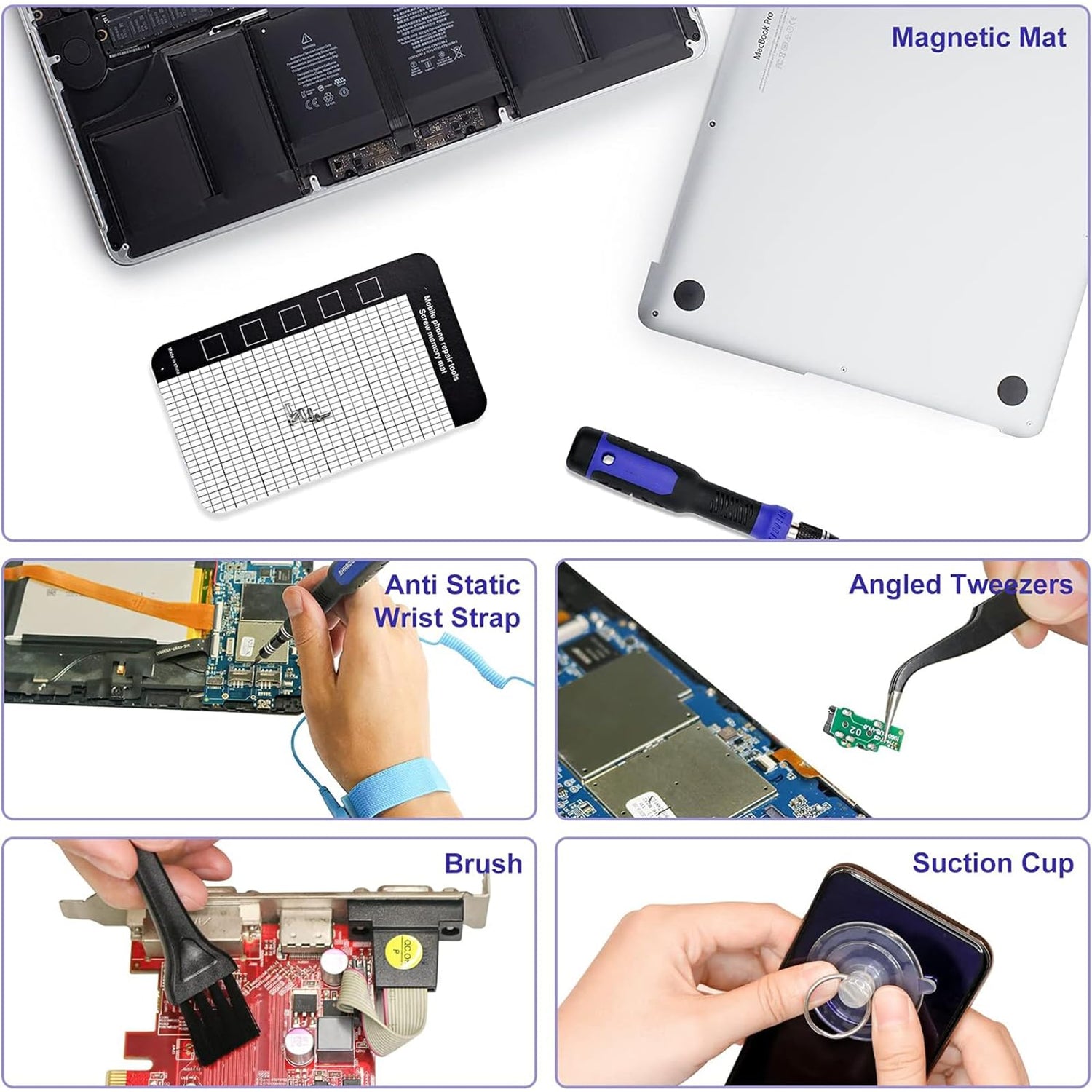 • Practical and Complete: Our electronics tool kit includes 27 essential tools for diverse repair needs. Protect electronics with the anti-static wrist strap, magnetizer demagnetizer tool, and magnetic mat for organized screw storage. Use the suction cup for screen removal and include a brush and cloth for cleaning.