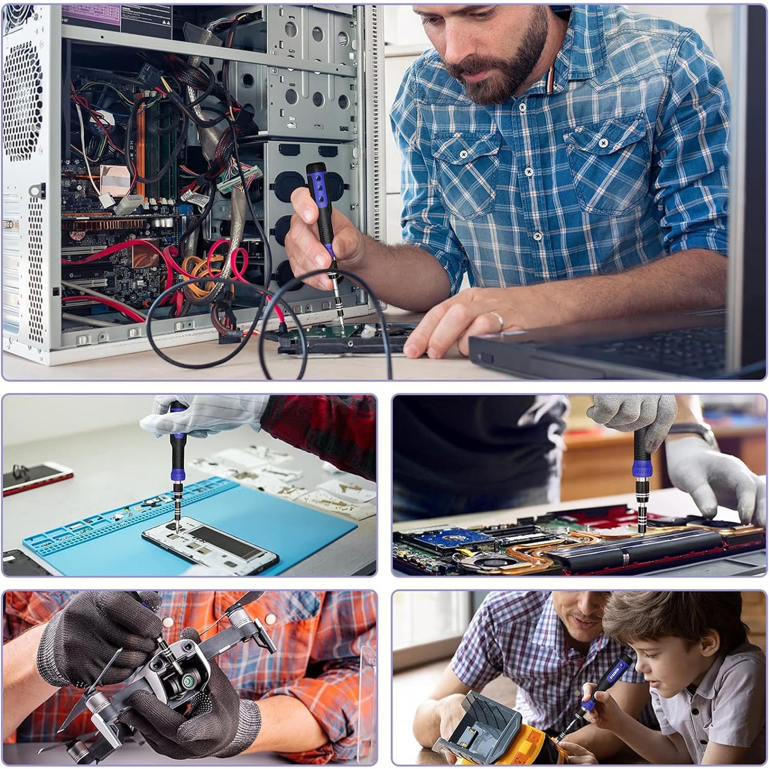 • Professional and Ergonomic: Our computer tool kit is expertly designed for enhanced repair capabilities. The knurled grip handles offer ergonomic control and maximum torque, while magnetic bit drivers ensure easy handling and screw extraction. Clear size markings on each bit expedite identification, and duplicates of commonly used bits are included for added convenience.
