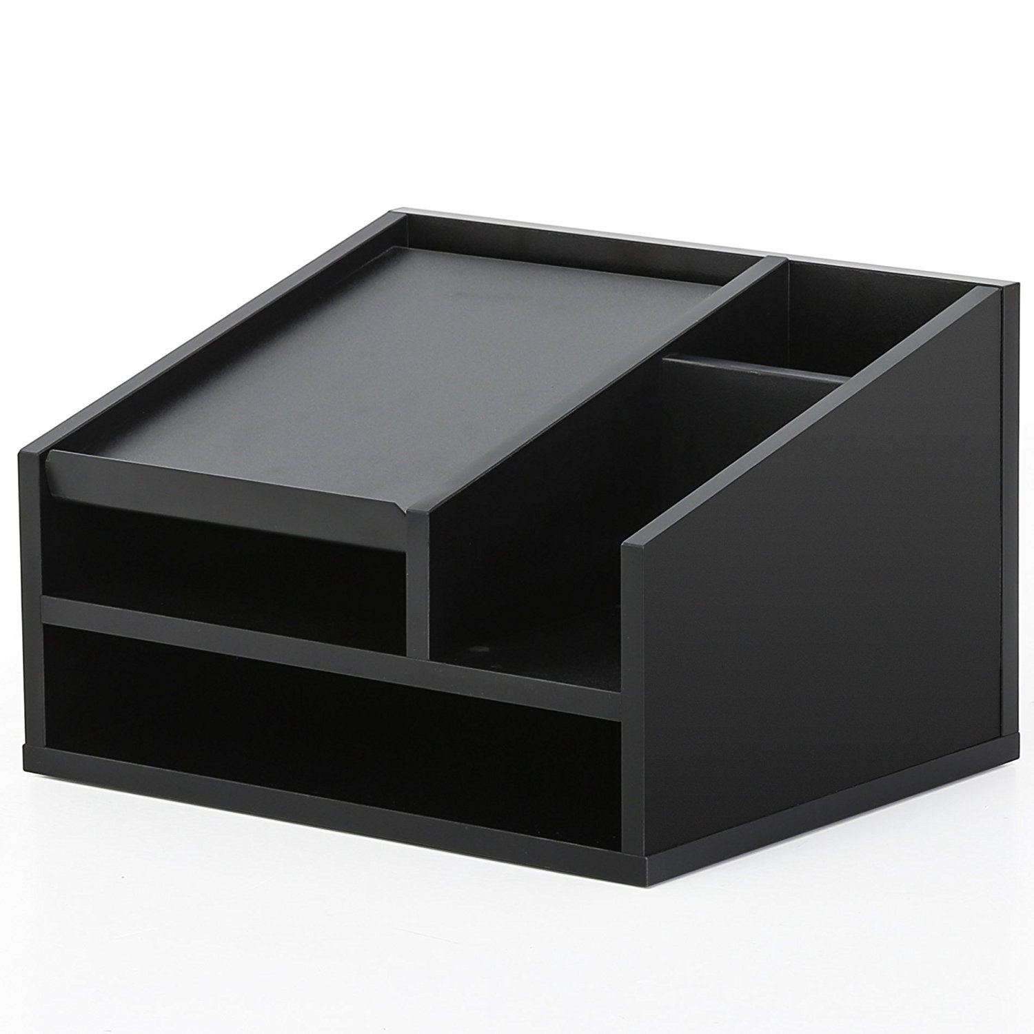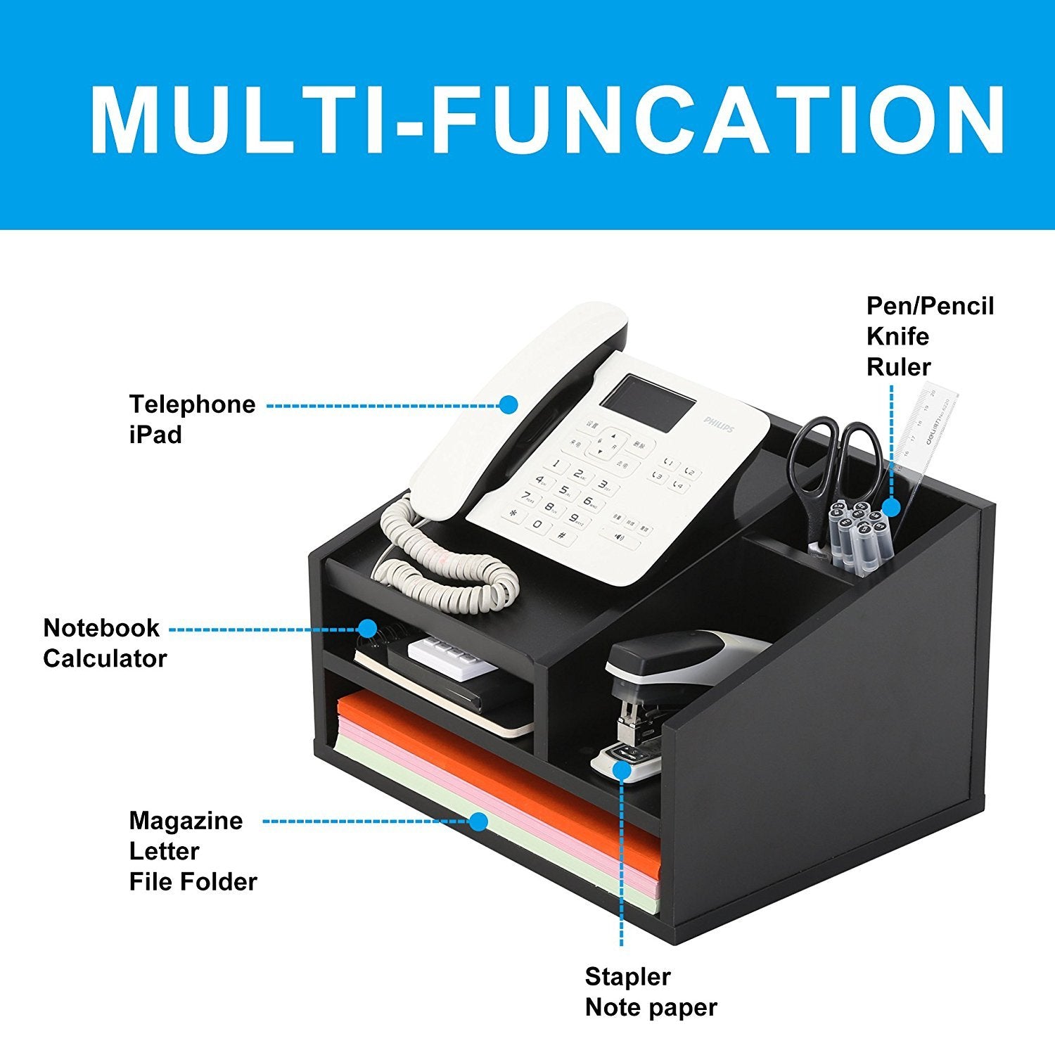 Wood Office Supplies Desk Organizer 5 Compartments with Letter Tray Phone Stand Pen Pencil Holder Black