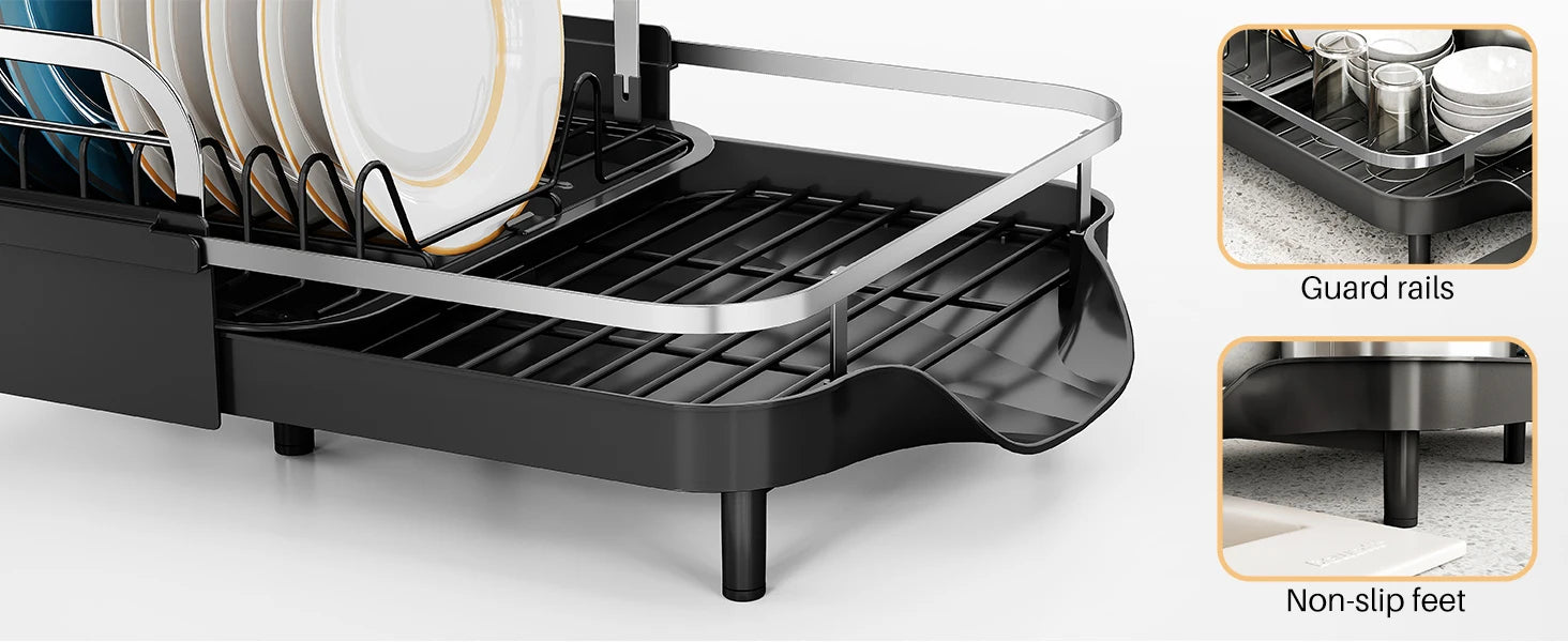 • Extendable design: Measures 12.8” D Γ— 4.7” H, with an adjustable width from 15.2” to 22.1” to fit limited counter space. Holds up to 10 plates, 6 bowls, and glasses.