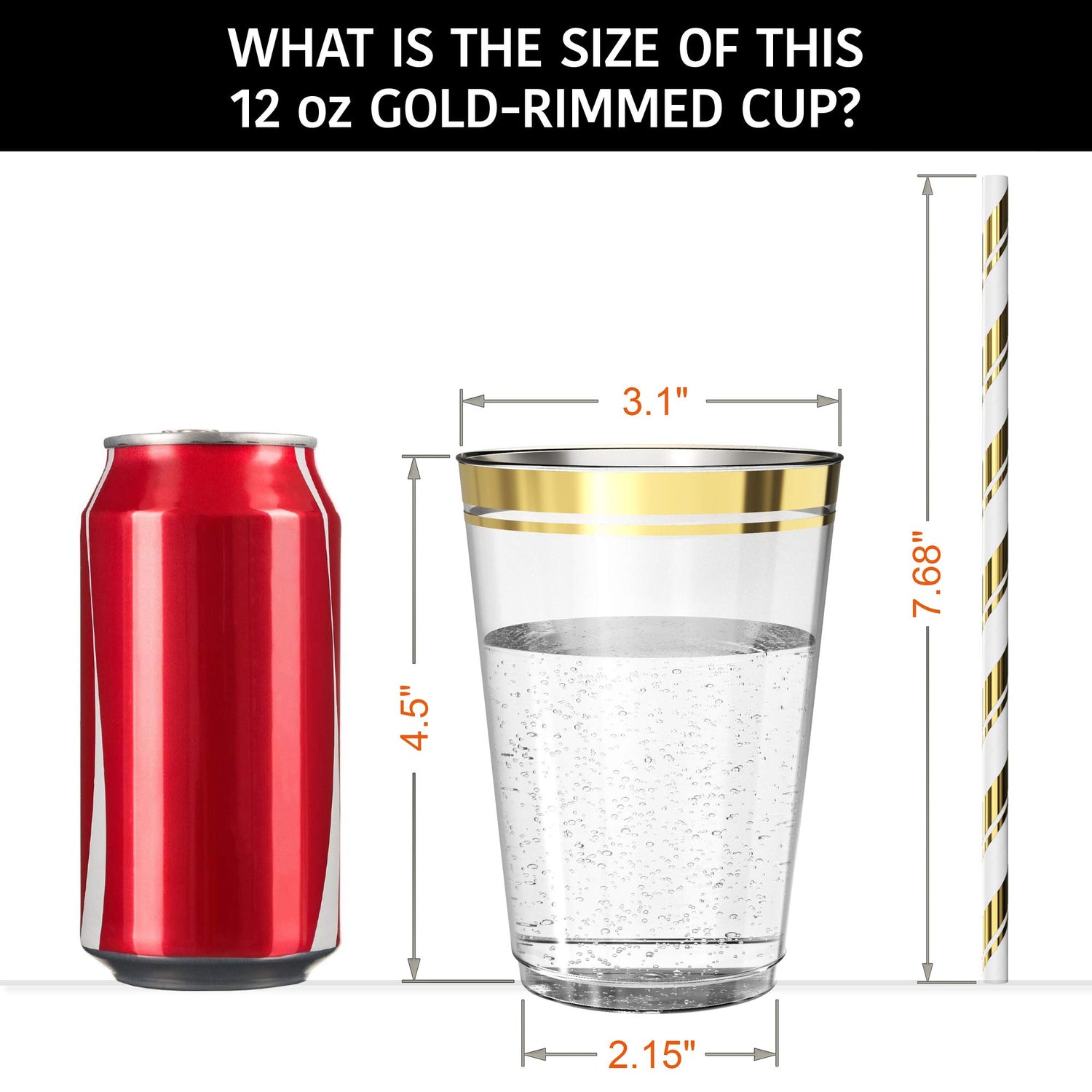 - š GORGEOUS MODERN DESIGN 175 pieces for 25 guests. Includes 25 Gold Plastic Forks, 25 Gold Plastic Knives, 25 Gold Plastic Spoons, 25x 12oz Gold Rimmed Cups, 25 Eco-Friendly Gold Rimmed Paper Straws, 25 Plastic Salad Plates & 25 Plastic Dinner Plates.