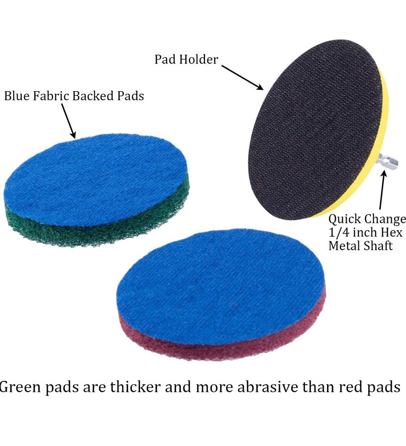 - FITS ANY CORDLESS DRILL - 1/4-inch (6mm) quick change metal shaft that fits any cordless drill. Package includes a drill attachment, 3 red pads and 3 green pads. Drill NOT Included.