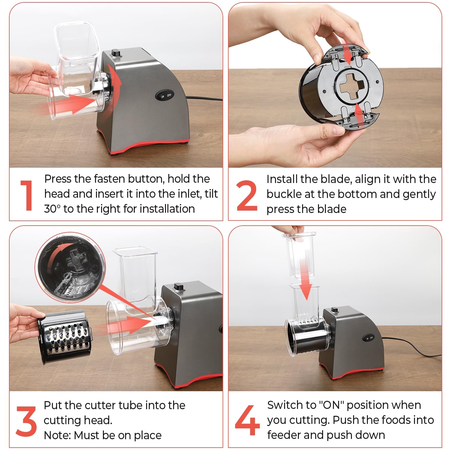- 5 in 1 Multi-Functional Electric Cheese Grater: Our electric cheese grater comes with 5 interchangeable stainless steel blades: slicing blade, wavy slicing blade, 2mm/4mm shredding blade, grinding blade, satisfy your different kitchen needs, free your hands.