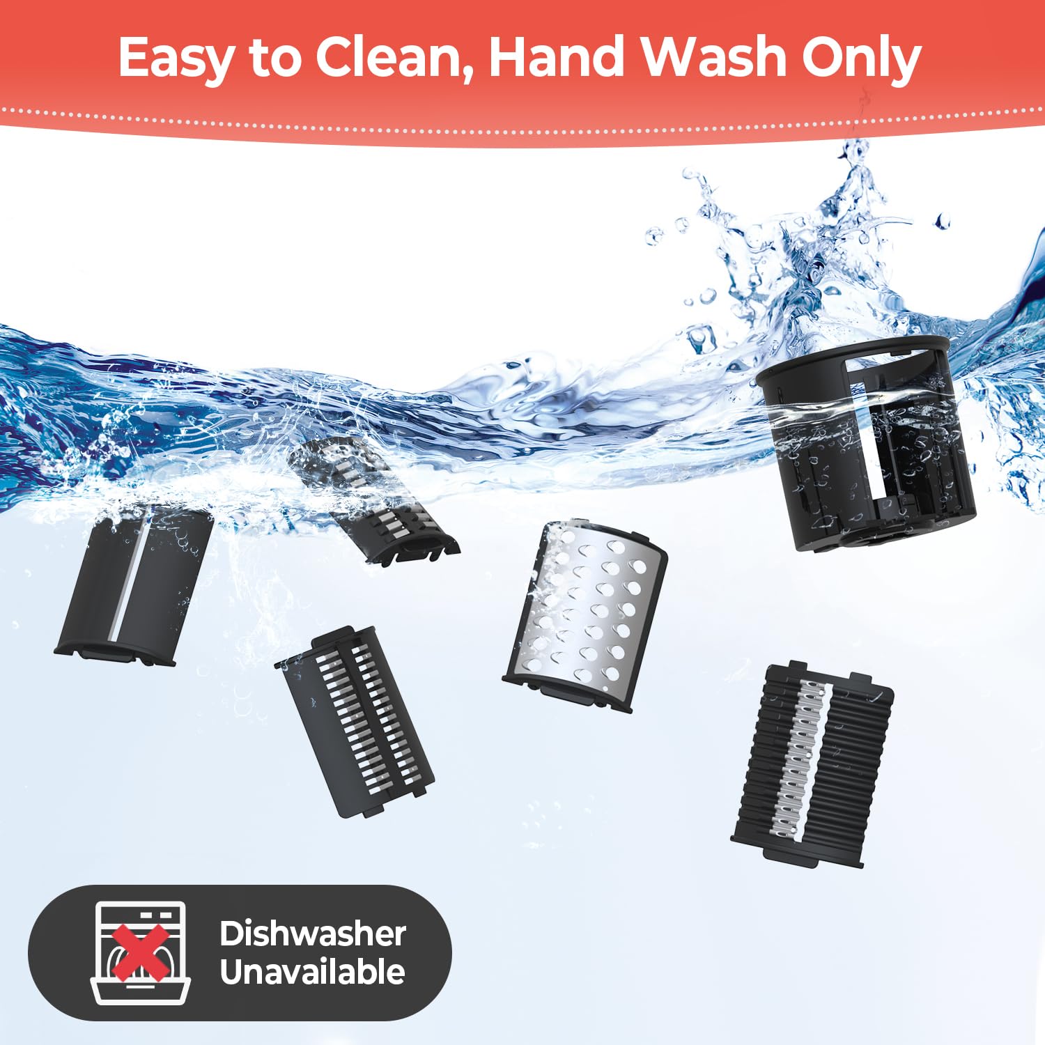 - Easy To Clean: All parts of this electric salad maker is detachable, the base of cheese grater only needs to be wiped down with a damp cloth and can't placed in water, other parts just wash it under a stream of water for a few seconds, no annoying cleaning steps.