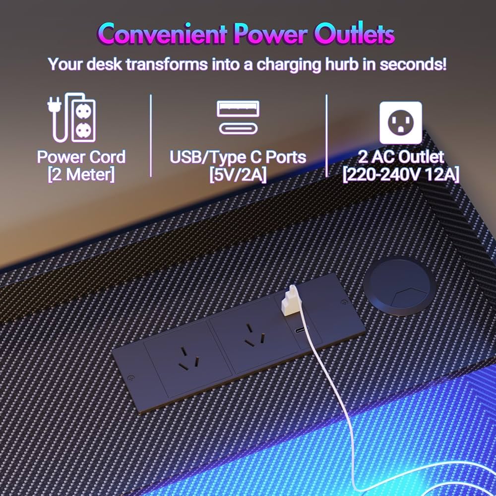 - Standing Desk with Power Outlets: Stay powered up and connected with this desk's cleverly designed power strip, offering 2 AC outlets, 1 USB and 1 type C port. Simultaneously charge devices like iPhones and laptops without interruptions during your gaming or work sessions. Plus, the 2-meter power cord gives you flexibility in positioning your standing desk.