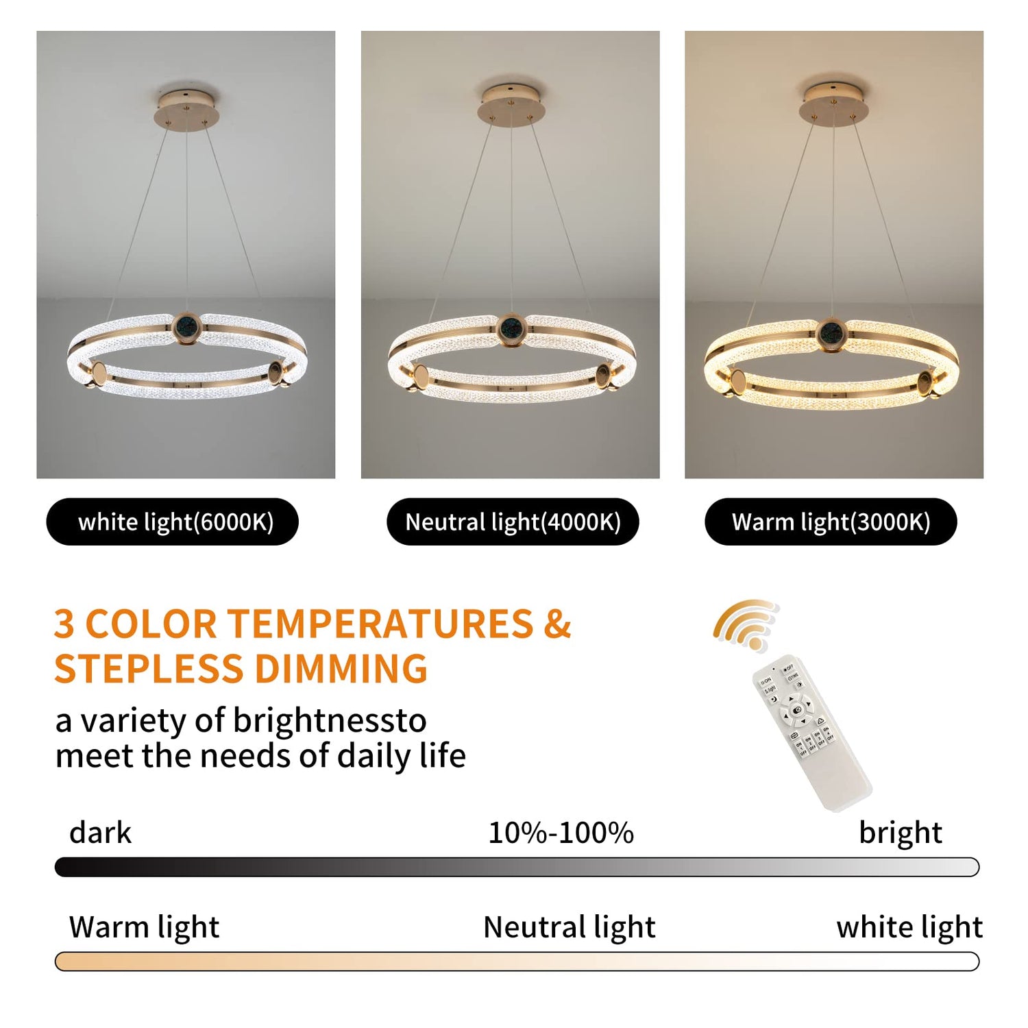 Modern LED Chandelier 48W Round Ring Pendant Lighting with Acrylic in Crystal Shape Dimmable Remote Control Adjustable Circular Ceiling Light Fixture for Dining Living Room, Plating Gold