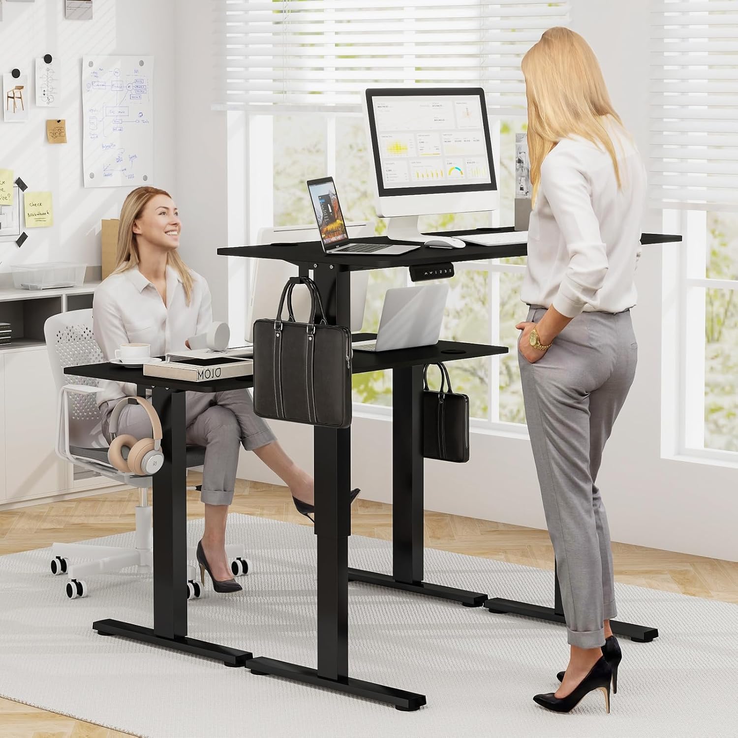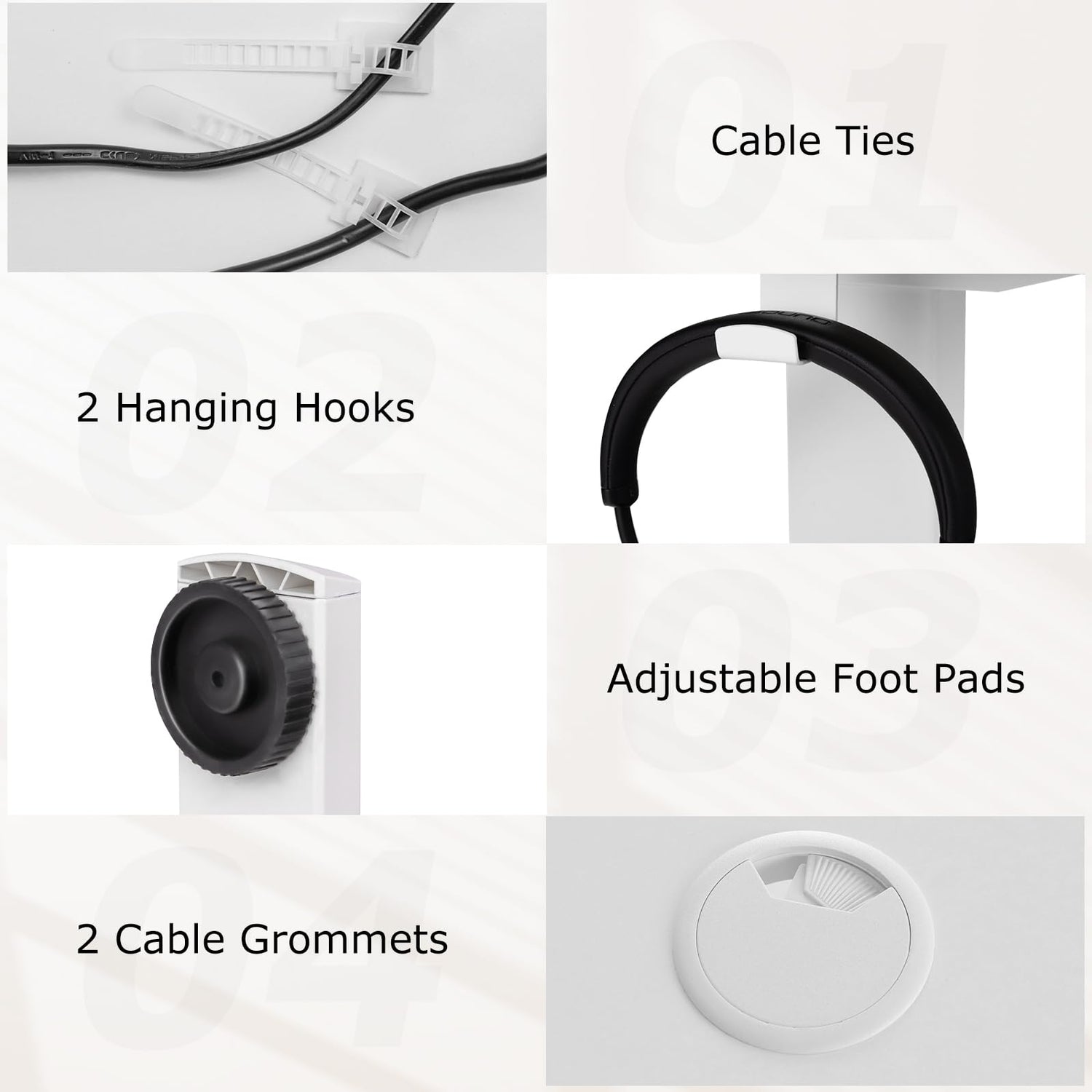- Enhanced Organization Features: Enjoy the added convenience of the adjustable desk's built-in hanging hooks and sleek cable management system. It allows for easy accessory storage and uncluttered cable routing to maintain a clean and tidy work area.