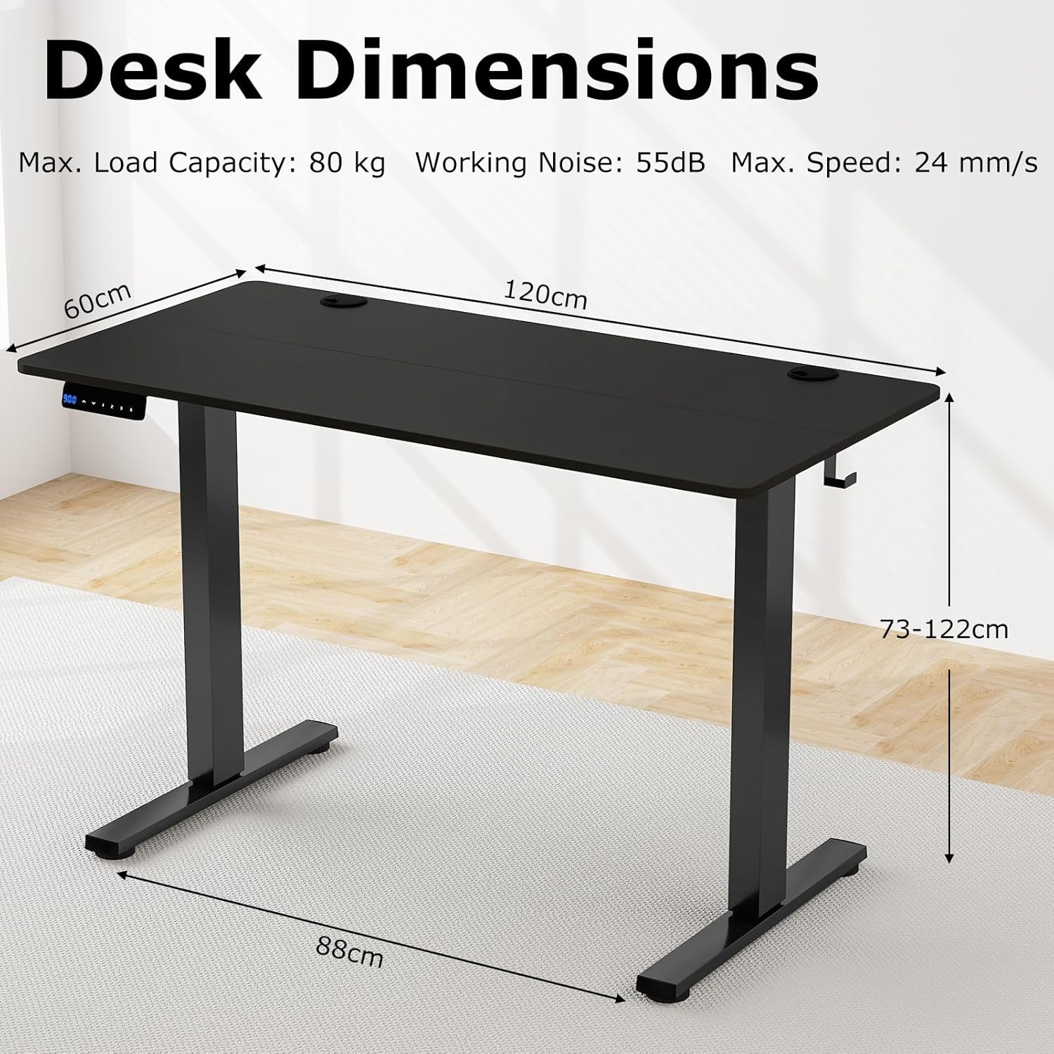Electric Standing Desk, 120 x 60 cm Sit Stand Home Office Desk with 3 Memory Height Settings, Height Adjustable Computer Desk with 2 Hanging Hooks & Cable Management