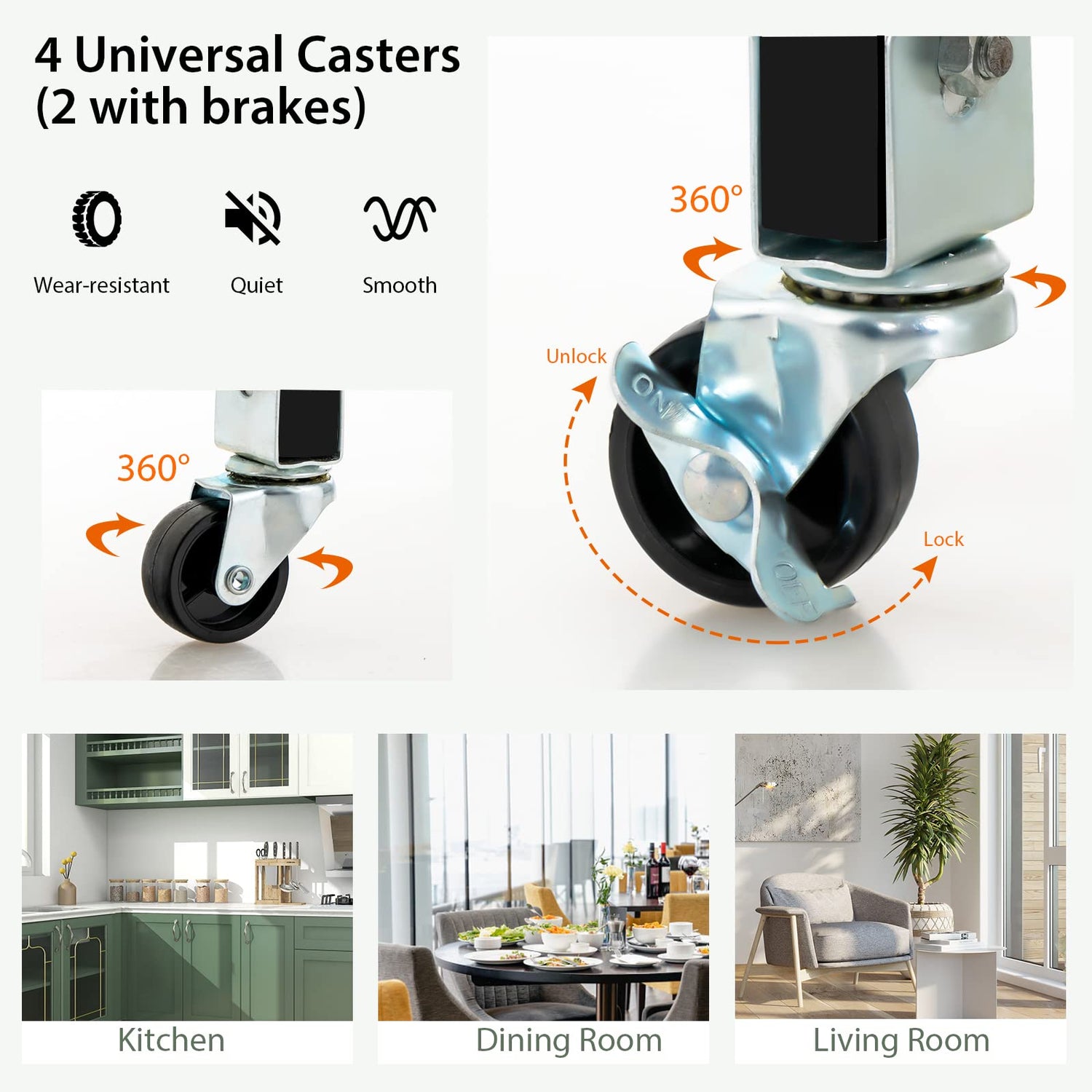 • Effortless Mobility & Safe Parking: The kitchen serving trolley is equipped with 4 iron universal casters, so you can move the cart anywhere you want to relocate it. Additionally, 2 of the casters are lockable. Once it is in position, just step on the brakes to keep the trolley stable.