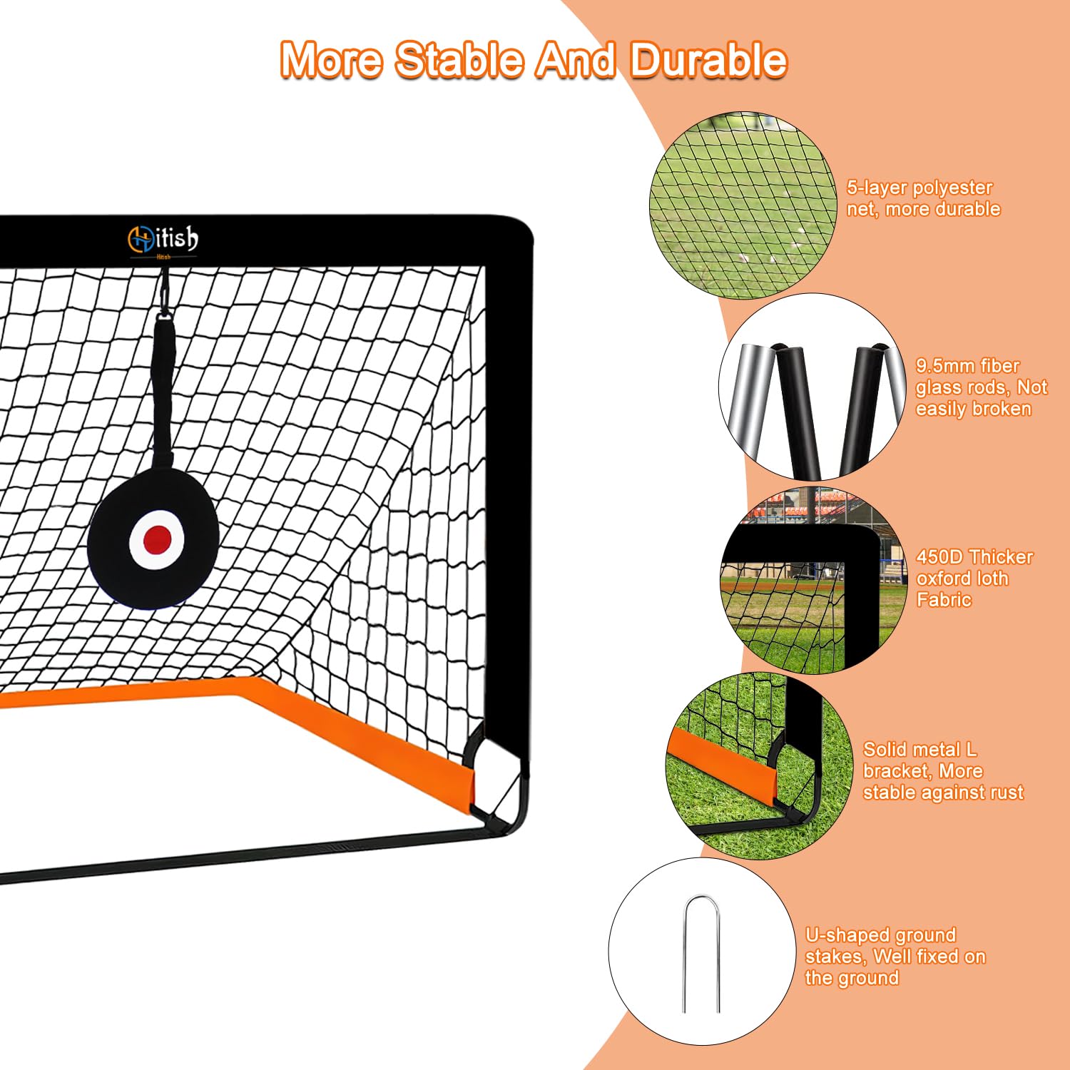 - Quick Assembly & Extreme Stability: The first installation of soccer net only requires three steps, first put the poles into the Oxford cloth, secondly connect the poles with metal L bracket, and finally fix them with U-shaped ground stakes for optimal stability, it can withstands strong winds and heavier kicks. Very easy to install and extremely stable