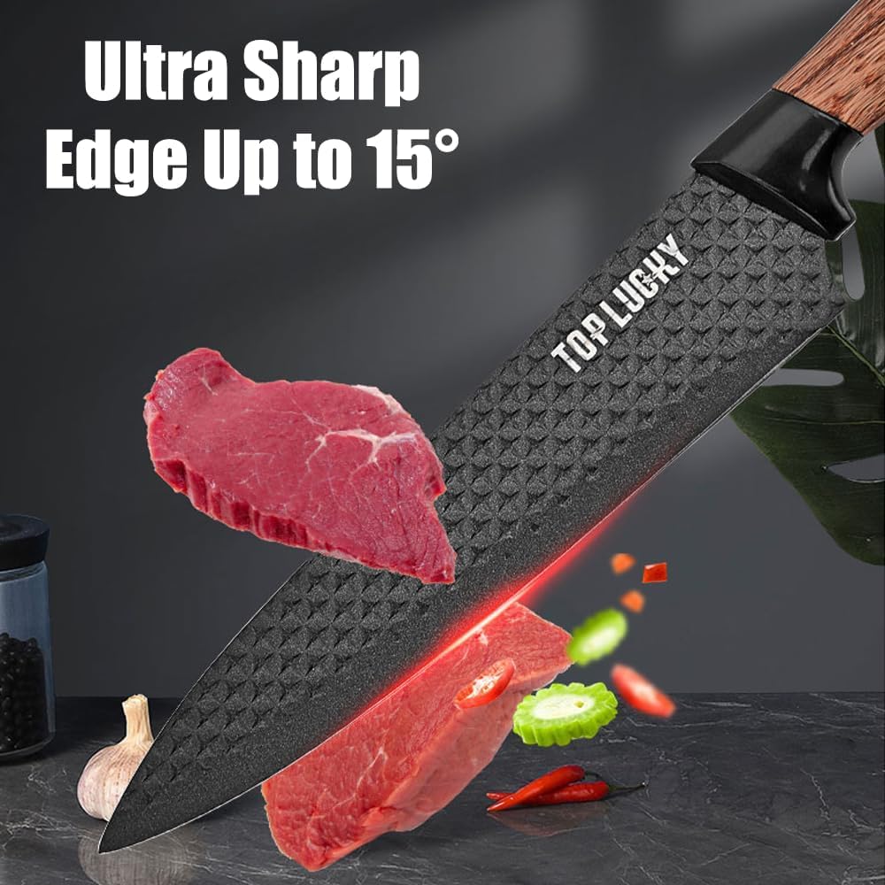 - Excellent Quality: This 6-Piece Black Set is made of high-quality 3CR13 stainless steel with three-pass processing, low temperature quenching, painting and blade 1000° heat treatment with exceptional rust resistance and corrosion resistance, makes knives extraordinary performance in edge-retention, very durable and sharp.