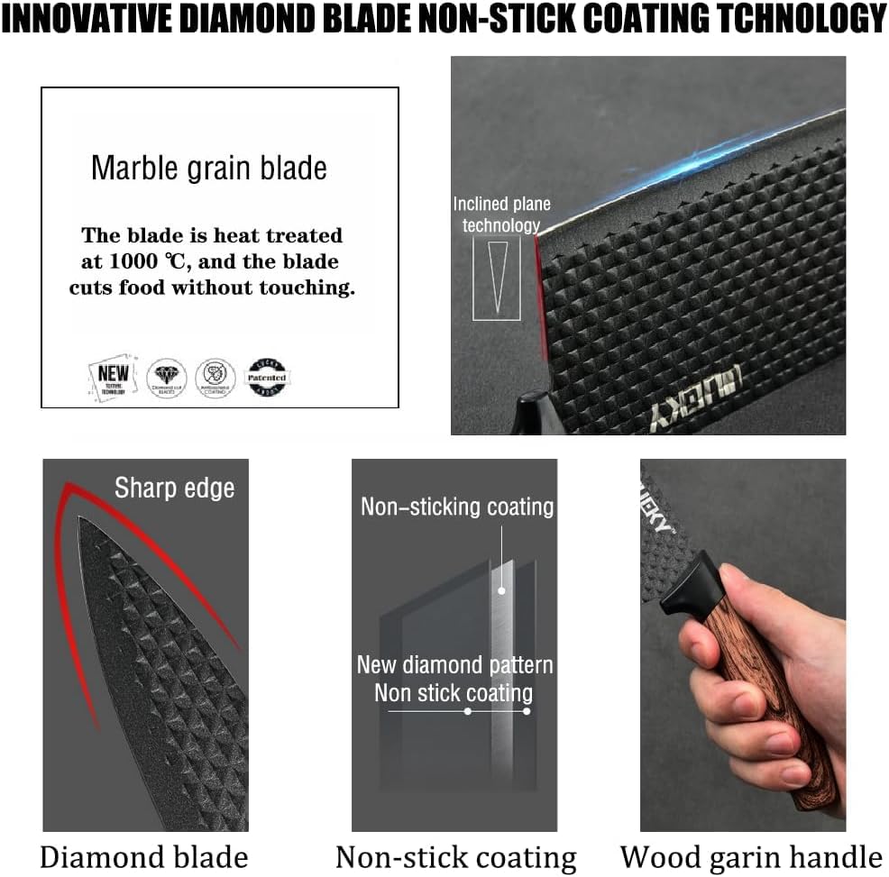- Unique Blade Design: The blade is designed with a star texture, unique and beautiful in shape, and has a high-quality non-stick coating, this coating has excellent corrosion and oxidation resistance, enhancing its non-stick properties, so food does not stick to the blade when using the knife and very easy to clean.
