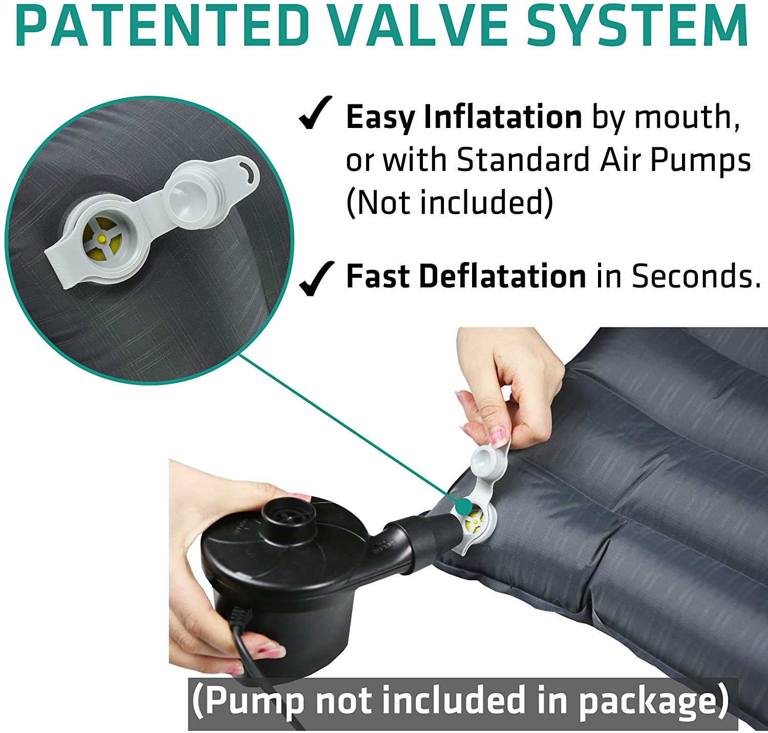 • SUPER EASY to INFLATE and DEFLATE with our enlarged air valve: Blow air to your desired firmness by mouth or using standard electronic pumps (sold separately) and you are ready for a good night's sleep outdoors! Deflation is as easy as opening the valve and pushing out the air, then folding the mat back to its carrying bag. You will be ready to go in seconds!