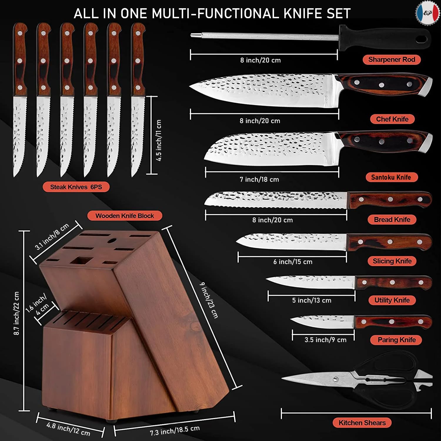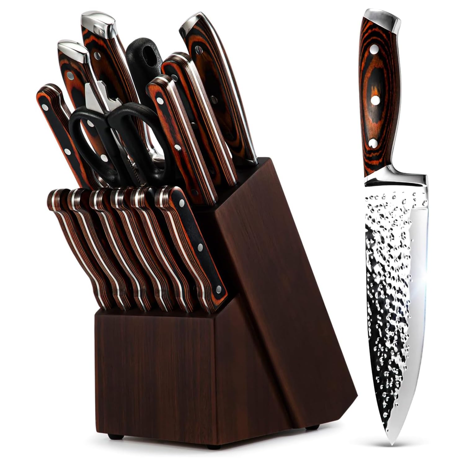 Kitchen Knife Set 15-Piece with Wooden Block. Ultra Sharp High Carbon German Stainless Steel Hammer Pattern Chef & Steak Knives. Full Tang Design with Forged Triple Rivet. Boxed Knife Set