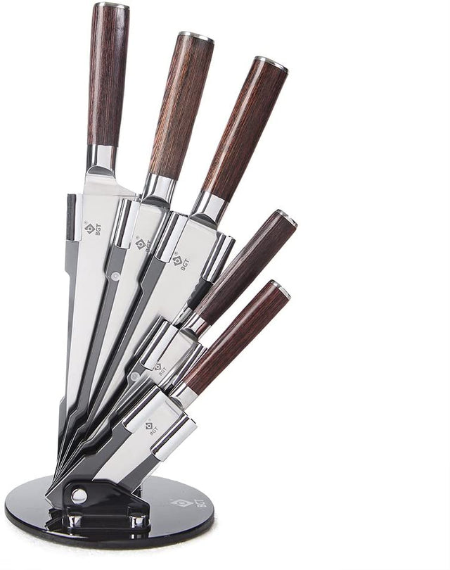 - ALL-IN-ONE COMPLETE SET: A specialized set of kitchen knives for all your chopping needs. Each set includes a 3.5 Inch Paring Knife, 5 Inch Utility Kitchen Knife, 7 Inch Japanese Kitchen Knife, 8 Inch Bread Knife, 8 Inch Chef Knife, and Elegant Acrylic Knife Stand.