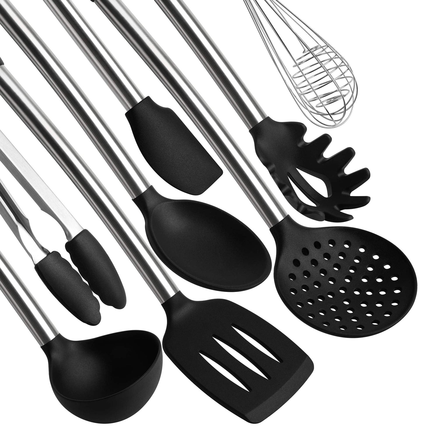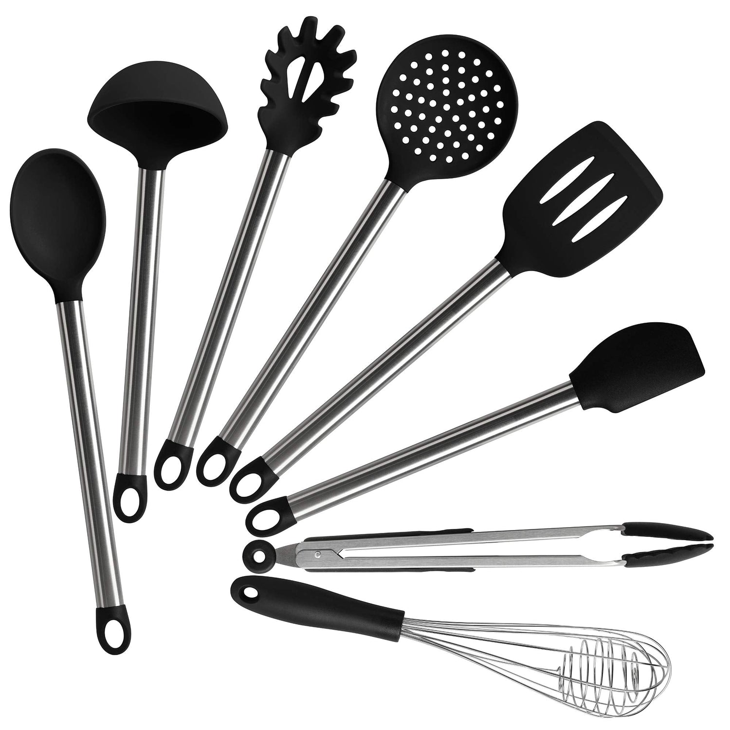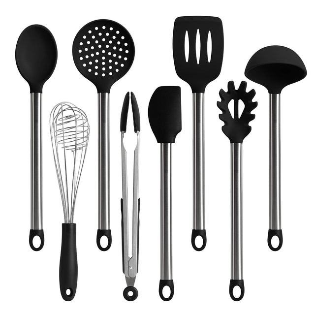 - COMPLETE SET OF 8: Professional or home cook, this set of 8 kitchen utensils gives you all the tools to complement your dishes and make cooking much easier. The set includes 1 x Spaghetti server,1 x Long spoon,1 x Solid Spoon,1 x Ladle,1 x Slotted Spatula ,1 x Scrapers,1 x Whisk,1 x Tongs