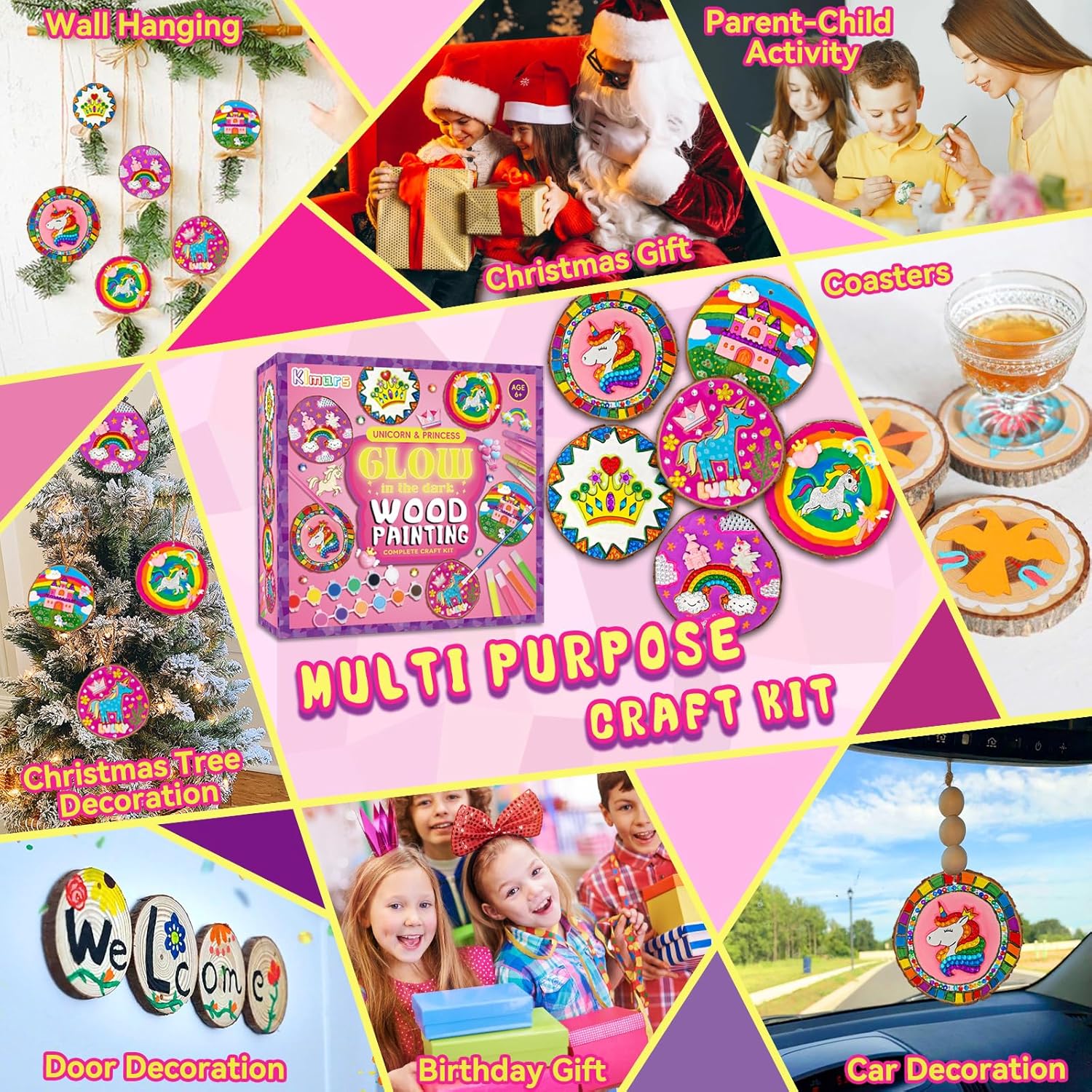 Unleash the magic of creativity with Klmars Glow-in-the-Dark Wood Painting Kit! Designed for unicorn lovers, girls, and kids, this enchanting craft kit is the perfect parent-child activity that combines fun and imagination. With our glow in the dark paint and unicorn resin charms, your little ones can create their very own unicorn-themed crafts.Let their artistic skills shine as they explore the world of crafts for kids. This kit is packed with everything they need to bring their creations to life, including wooden painting kit, craft supplies, and art materials. From painting wooden unicorns to decorating wood slices with unicorn resin charms, the possibilities are endless.Not only will your kids have a blast, but they will also develop essential skills such as hand-eye coordination, creativity, and problem-solving. Our wooden painting craft kit is not just a toy, it's a gateway to a world of imagination and artistic expression.Whether it's a birthday gift or a rainy day activity, our craft kit is sure to bring joy and excitement. Watch their faces light up as their creations come to life in the dark, creating a magical ambiance in their bedroom.Invest in their creativity and provide endless hours of entertainment with our high-quality and safe craft supplies. Let their inner artist shine and create memories that will last a lifetime with our unicorn wooden painting kit.