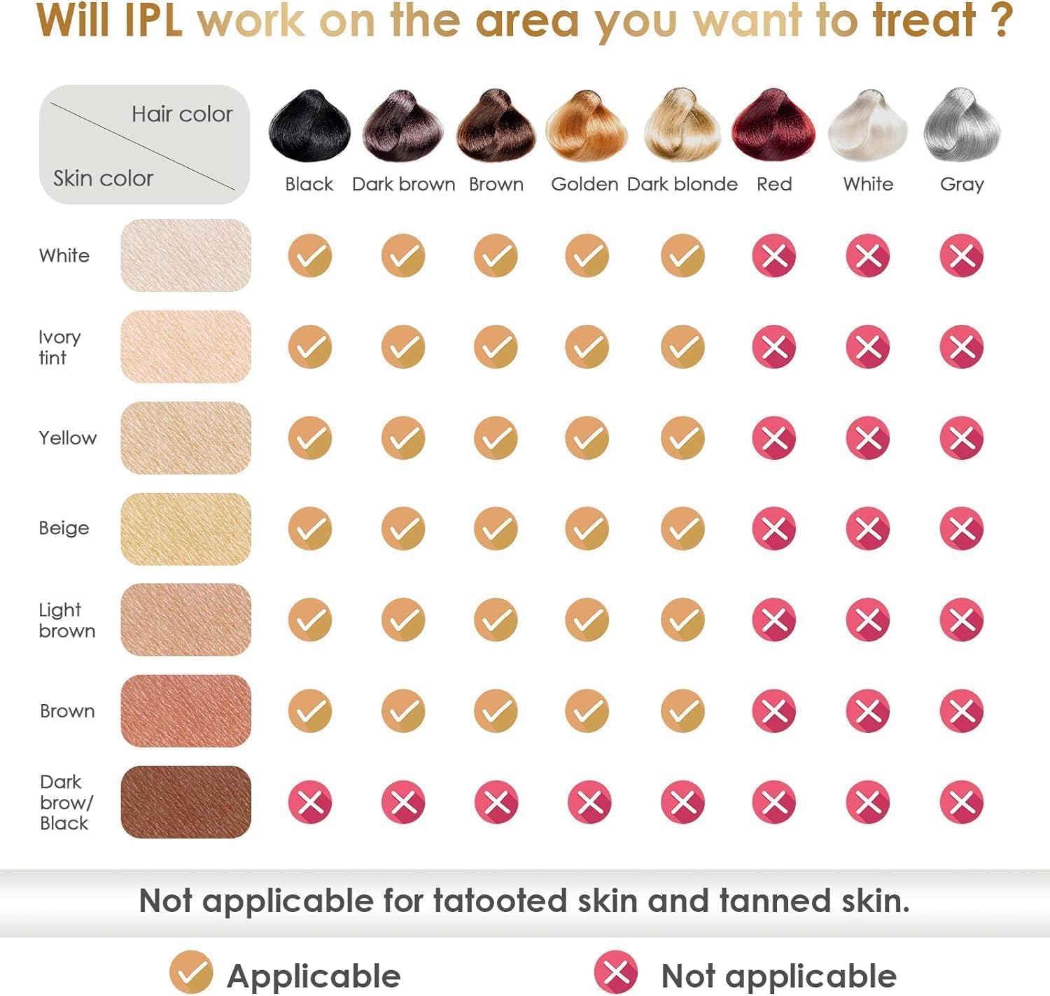 • Laser Hair Removal: IPL stands for intense pulsed light. It targets unwanted hairs at the root and destroys them with light pulses (IPL) without burning or damaging your skin. It stops hair from growing back for long-term hair reduction. Anyone can use the laser hair removal safely from head to toe including upper lip, chin, underarms, legs, arms, and bikini area.