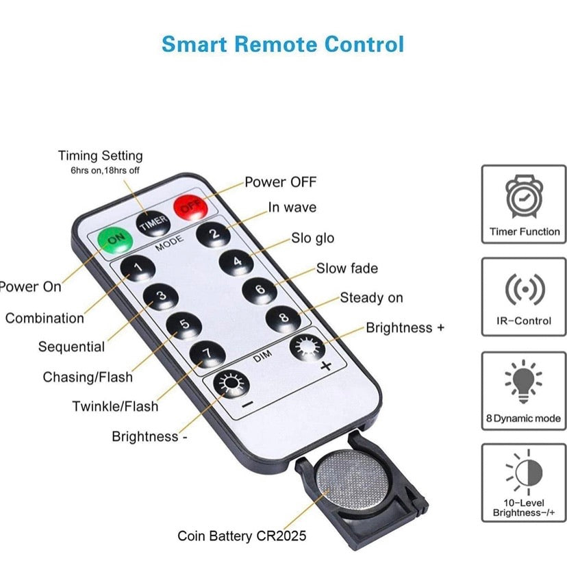 - Easy Operation: With 13 keys Remote Control and 1 button on the battery box, you can adjust the Brightness or switch to in wave quintal/slo glo/ flash/slow fade/ twinkle/steady
