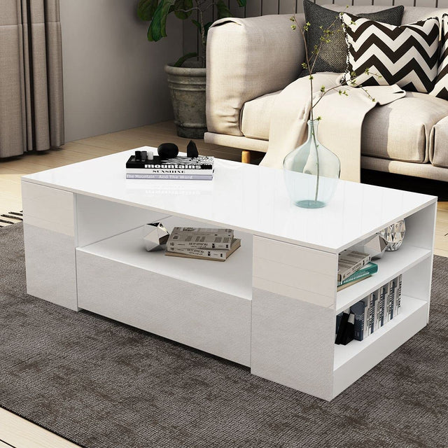 Updating the overall look of your living room while keeping everything organised with this modern coffee table which is strikingly crafted with a high gloss white coating finish.