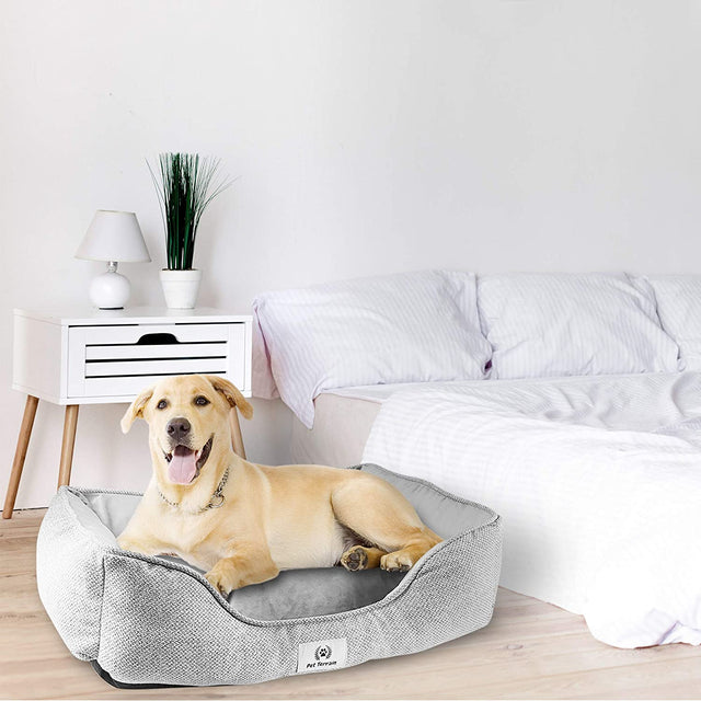 Available in generous sizes and beautiful colour: choose the bed from 2 generous sizes based on the size chart. The bed comes in a beautiful cosy neutral grey colour that will blend in your home décor seamlessly and conceal your dog’s fur for a polished look.