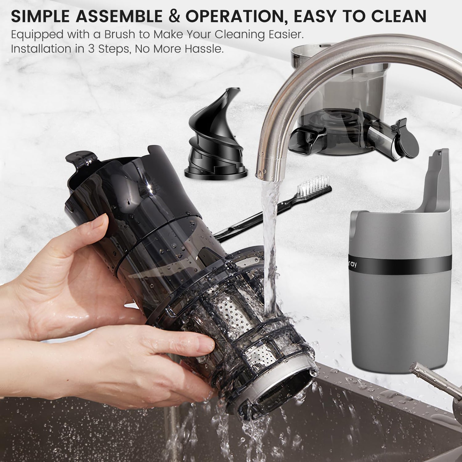 - Easy to Clean Fruit Juicer - With protection design, please ensure the installation is in place before use, otherwise this whole fruit slow juicer cannot be started. Comes with two cups and cleaning brush on this fruit juicer machine. Easy to assemble, operate, and clean. Ideal for high yield and dry pulp.