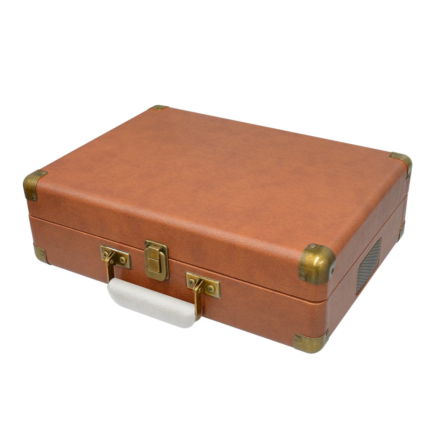 - Vintage and classic brown exterior with stylish retro gold features. Retro briefcase-styled design that folds easily for convenient transport. Enjoy your favourite music anytime, anywhere