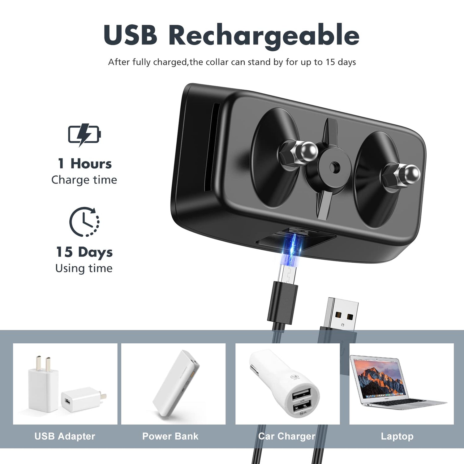 - The bark collar is rechargeable, charged in only 30 minutes, and works for about 12 days.