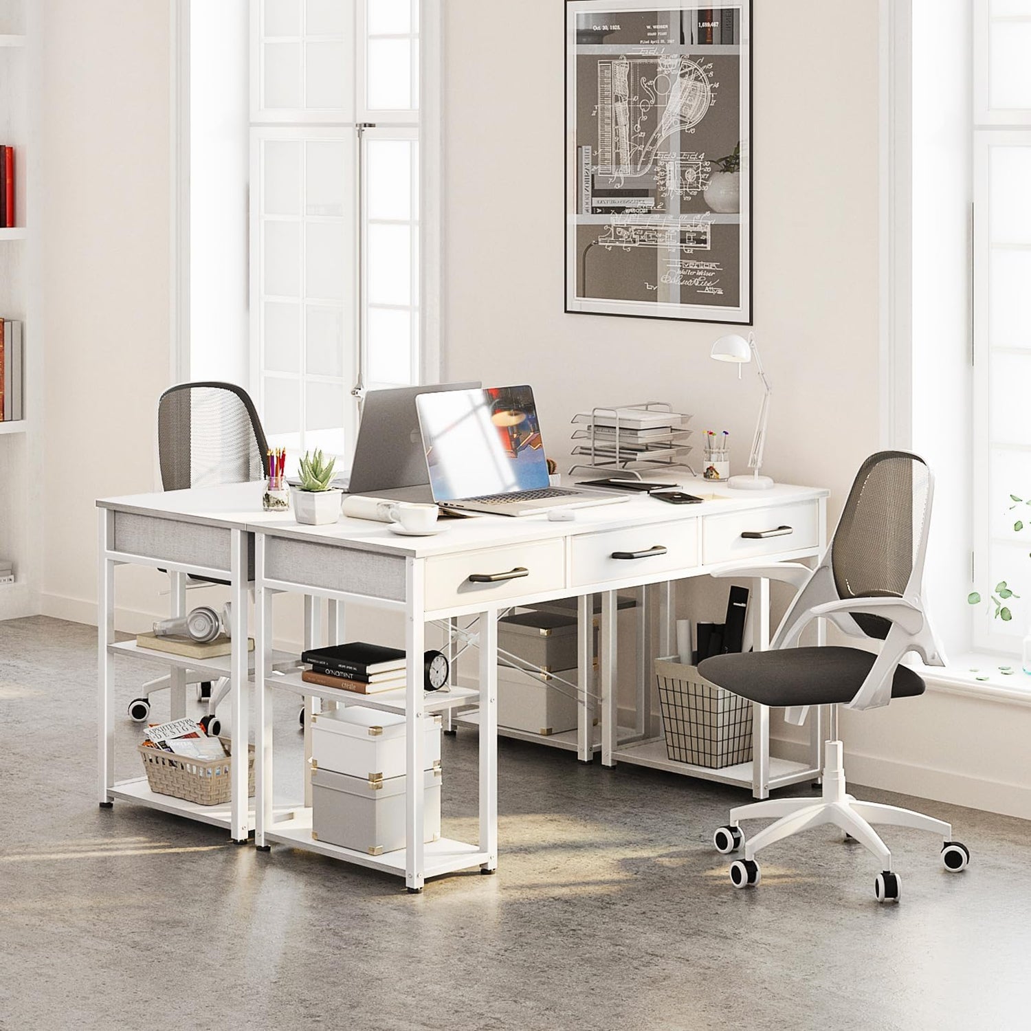 Office Small Computer Desk: Home Table with Fabric Drawers & Storage Shelves, Modern Writing Desk, 120 x 40 x 79cm,White