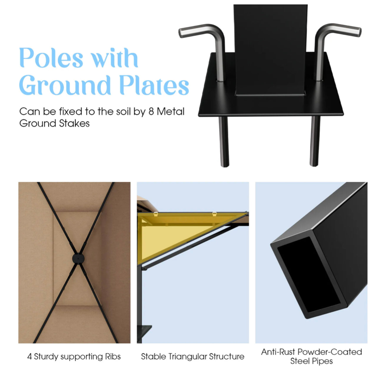- The bottoms of poles feature ground plates that can be fixed on the soil for more safety